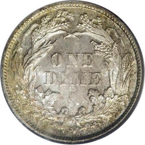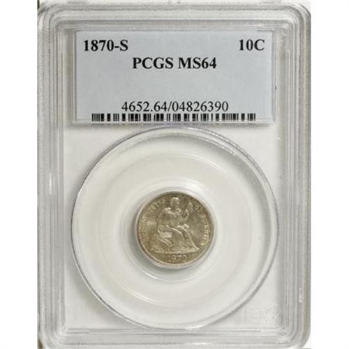 <B>1870-S 10C MS64 PCGS.</B></I> A remarkable coin that is seldom seen any finer, with just 17 better pieces certified by both NGC and PCGS. The surfaces are mostly brilliant with splashes of peripheral gold and iridescent toning. The lustrous surfaces have reflective fields that are nearly prooflike. Slight design weakness is limited to Liberty's head. Population: 5 in 64, 10 finer (8/07).<I><BR>From The Beau Clerc Collection.</B></I><BR><BR><B>Coin Engraver:</B> Christian Gobrecht<BR><BR><b>Shipping:</b> Coins & Currency (<a target="_blank" href="http://www.heritageauctions.com/common/shipping.php">view shipping information</a>)
