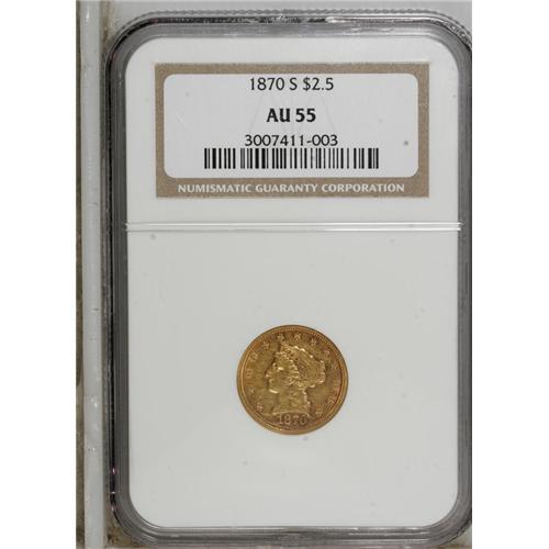 <B>1870-S $2 1/2 AU55 NGC.</B></I> Light but distinct wear is noted on the highpoints of this Choice AU example. The orange-gold fields retain significant luster, while the yellow-tinged devices have a number of marks. The year and mintmark evoke such rarities as the 1870-S three dollar gold piece and silver dollar, which gives this coin added cachet. Census: 13 in 55, 30 finer (1/07).<BR><BR><b>Shipping:</b> Coins & Currency (<a target="_blank" href="http://www.heritageauctions.com/common/shipping.php">view shipping information</a>)