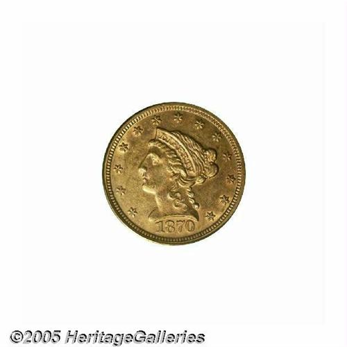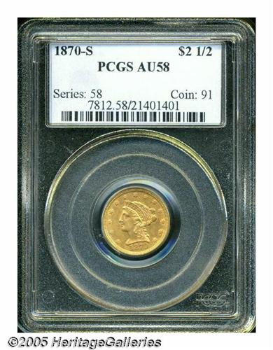 1870-S $2 1/2 AU58 PCGS. Only 16,000 Quarter Eagl