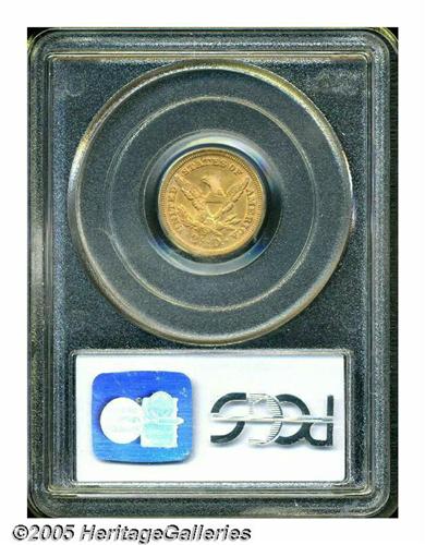 <B>1870-S<$2 1/2> AU58 PCGS.</B></I> Only 16,000 Quarter Eagles were struck at San Francisco in 1870, making this a deservedly scarce issue. Although somewhat available through the lower AU grade levels, near-Mint survivors such as this are rarely encountered. This piece is well defined on the obverse and has only hallmark striking softness on the eagle's left (facing) leg feathers and on the olive leaves. With ample luster and largely mark-free surfaces, this coin seems high end for the grade, despite minor wear on the eagle's head an neck. A significant find for the serious Liberty Quarter Eagle collector.