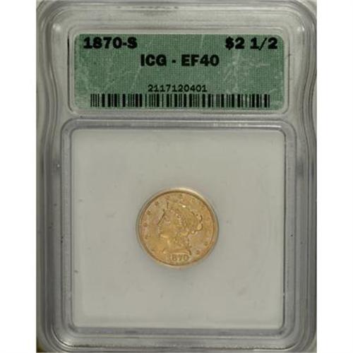 <B>1870-S $2 1/2 XF40 ICG.</B></I> NGC Census: (10/85). PCGS Population (7/51). Mintage: 16,000. Numismedia Wsl. Price for NGC/PCGS coin in XF40: $346. (#7812)<BR><BR><B>Coin Engraver:</B> Christian Gobrecht<BR><BR><b>Shipping:</b> Coins & Currency (<a target="_blank" href="http://www.heritageauctions.com/common/shipping.php">view shipping information</a>)