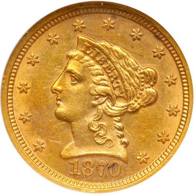 1870-S $2.50 Liberty. NGC graded AU-58. Nice golden toning. Only 16,000 minted. Frosty golden surfaces display much residual luster with natural patina. Sharp and appealing for this scarce, low-mintage San Francisco Mint issue. Pop 24; 12 finer. (PCGS # 7812) .