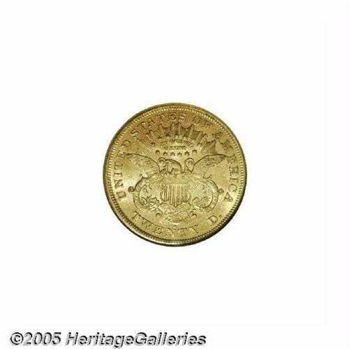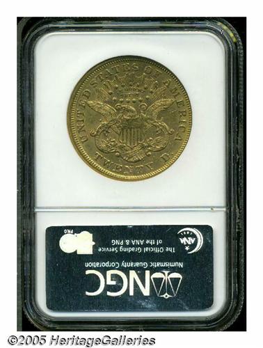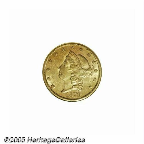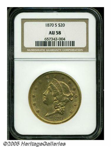 <B>1870-S<$20> AU58 NGC.</B></I> While the '70-S is only moderately scarce in lower grades, it is somewhat elusive in AU and very scarce in Uncirculated grades. The surfaces are reddish-gold and show good remaining luster, with traces of friction evident over the devices. Numerous small abrasions are scattered over the two sides.