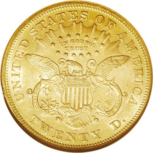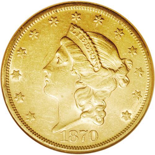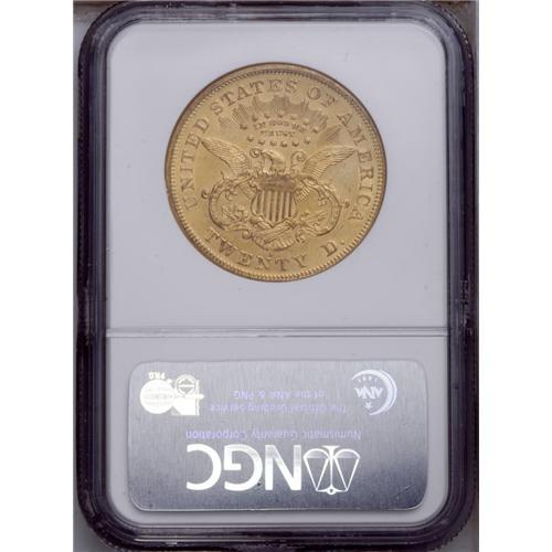 <B>1870-S $20 AU58 NGC.</B></I> While the '70-S is only moderately scarce in lower grades, it is somewhat elusive in AU and very scarce in Uncirculated grades. The surfaces are reddish-gold and show good remaining luster, with traces of friction evident over the devices. Numerous small abrasions are scattered over the two sides.