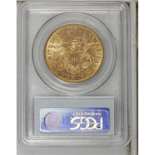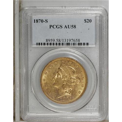 <B>1870-S $20 AU58 PCGS.</B></I> Only a trace of wear is evident on the highest design points of this lustrous yellow-gold representative. Both sides have satiny luster that is only interrupted by the usual light abrasions that are associated with these large gold coins.<BR><BR><b>Shipping:</b> Coins & Currency (<a target="_blank" href="http://www.heritageauctions.com/common/shipping.php">view shipping information</a>)