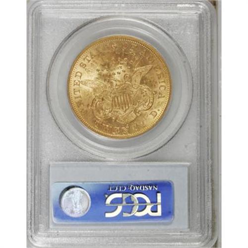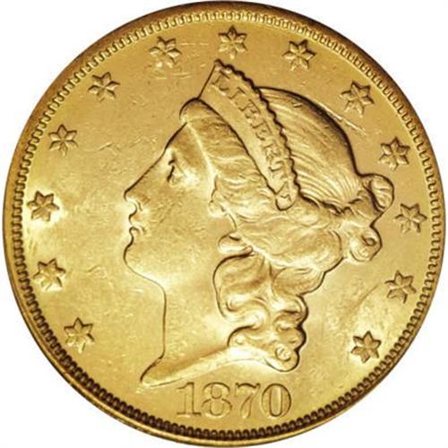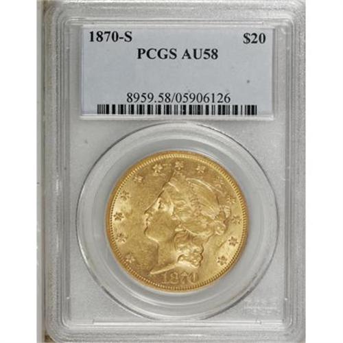 <B>1870-S $20 AU58 PCGS.</B></I> An impressive near-Mint example with frosty yellow luster and excellent design details. Even the obverse stars are virtually full and complete. The significant mintage of 982,000 coins suggest that the 1870-S is not a particularly rare date, yet NGC and PCGS have only certified 66 pieces in all Mint State grades.<BR><BR><B>Coin Engraver:</B> James B. Longacre<BR><BR><b>Shipping:</b> Coins & Currency (<a target="_blank" href="http://www.heritageauctions.com/common/shipping.php">view shipping information</a>)