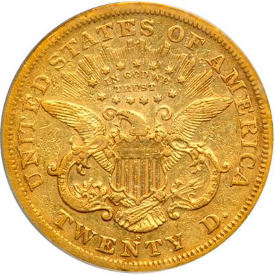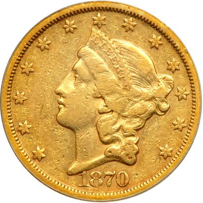 1870-S $20 Liberty. PCGS graded VF-35. Lightly toned and moderately worn from its use in circulation. While gold wasn't plentiful on the East Coast in the 1870s, it did circulate widely West of the Rocky Mountains as the main high-value currency (PCGS # 8959).