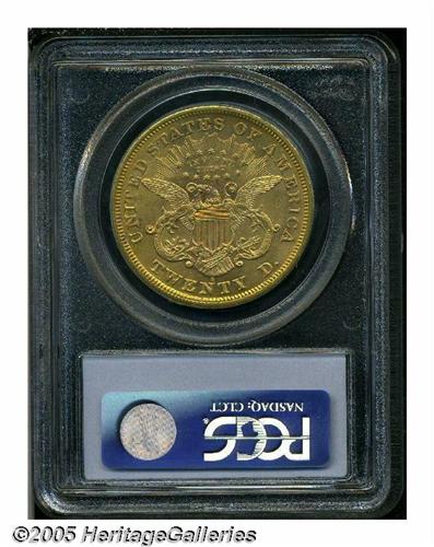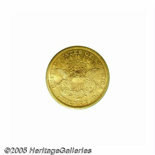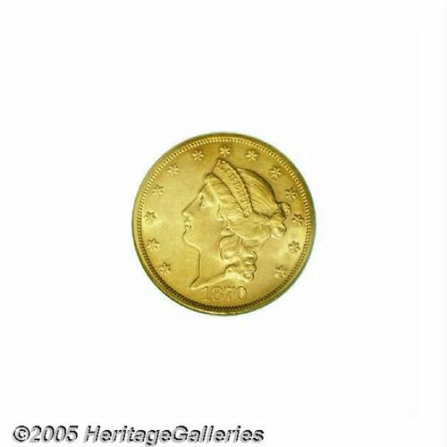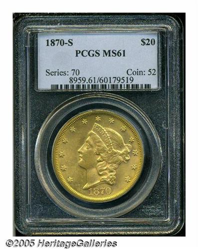 <B>1870-S<$20> MS61 PCGS.</B></I> The 1870-S has a low survival rate relative to the original mintage figure of nearly one million coins. It is most often seen in XF40 to AU53 condition and it becomes scarce in the higher About Uncirculated grades. This is a rare and undervalued issue in Uncirculated grades with approximately 25-35 pieces known. Virtually all of these are in the MS60-61 range and it is unlikely that a Choice Uncirculated piece exists. Bright mint luster races around the surfaces of this coin. Rich orange-gold patina colors both sides and there are remarkably few abrasions present. The grade is limited by an area of dark discoloration over the eagle's head. Population: 11 in 61, 0 finer (5/05).
