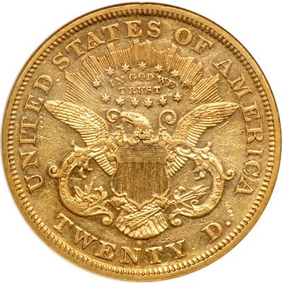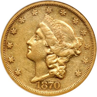 1870-S $20. NGC graded AU-50. Dazzling semireflective luster is noticeable in the protected areas.