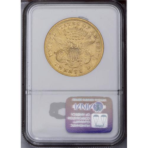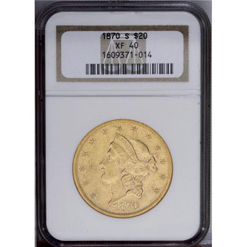 <B>1870-S<$20> XF40 NGC.</B></I> The apricot-gold surfaces of this '70-S double eagle display luster remnants delicately clinging to some of the devices. Decent residual detail is seen on the design elements, except for softness in some of the star centers and in portions of Liberty's hair. A few light abrasions are scattered over each side.