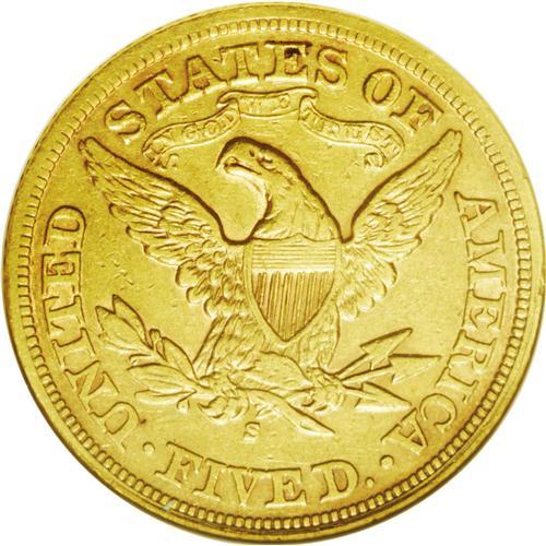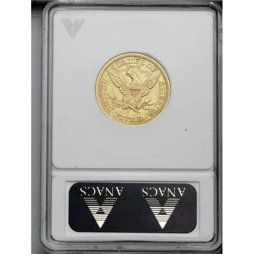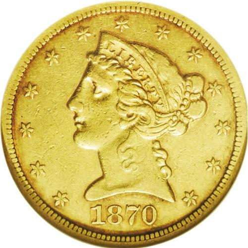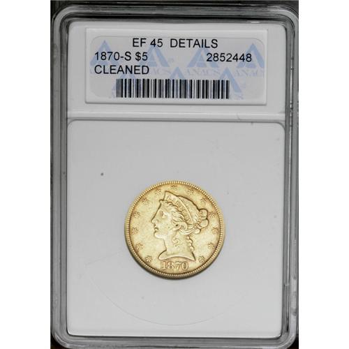 <B>1870-S<$5>--Cleaned--ANACS. XF45 Details.</B></I> With a mintage of only 17,000 pieces, this S-mint issue is as rare as the two preceding and two following issues from the California branch mint. This is a deep, reddish-gold example that exhibits moderate wear throughout. The surfaces are noticeably subdued as a result of the noted cleaning. Still, an attractive example if this highly elusive issue.