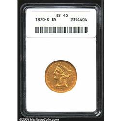 1870-S $5 XF45 ANACS.<p>Similar in rarity to the 1873-S, the 1870-S is more difficult to locate in all grades than the 1868-S, 1869-S, 1871-S, and 1872-S. The present Choice XF survivor is superior to the often encountered Fine or VF representative. The devices show ample evidence of a sharp strike and the abrasions are neither sizeable nor numerous. One of a mere 17,000 pieces produced, most of which have been lost to circulation. Important notice: We expect to be auctioning lots at the rate of 200-250 per hour. Sometimes eBay Premier live bid software cannot keep up with that pace, so we strongly recommend that you place a realistic proxy bid now as insurance to avoid disappointment. Also please note that all Heritage/CAA lots purchased through eBay Premier carry a 20% Buyer's Premium.