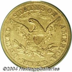 <B>1870-S<$5> XF45 PCGS.</B></I> Much scarcer than the mintage of 17,000 pieces would indicate. Most survivors are Fine or VF at best, with XF pieces only occasionally seen, and virtually unknown above the XF level. Termed by Breen as "prohibitively rare EF." The coin is well struck on the obverse with softly defined feathers on the eagle's neck on the reverse. Lightly abraded, the surfaces have a slight accent of reddish patina around the devices of each side. Population: 16 in 45, 15 finer (7/04).<BR><I>From The Velma & Bowie Lynch Collection, Part Four.</B></I> <BR><BR><B>Important notice:</B> Heritage usually auctions material at the rate of 200-250 lots per hour. On some occasions eBay Live bid software or the Internet may not be able to keep up with the pace of the auction. We recommend placing a realistic absentee bid now as insurance to avoid disappointment. Occasionally the auctioneer may eliminate or reject an eBay Live bid, and the auctioneer may also reopen a lot after the close of the eBay live bidding (usually because we missed an audience bid), and may reject your bid even if it shows you as the winning bidder. By bidding via eBay Live, you agree that Heritage may award the lot to another bidder at its sole discretion under the circumstances described above or any other reasonable circumstances. Since eBay bids are not shown to us until we open the lot on the floor, we treat those bids just like floor bids. In most cases the floor responds before the eBay bid is presented to us, due to Internet lag time, so for consistency we have made it a policy that floor bids are always considered first over tie eBay live bids. Also please note that all Heritage lots purchased through eBay Live carry a 20% Buyer's Premium. Please make sure you read the Terms and Conditions before you bid. </span></font></tr></table></td></tr></table>
