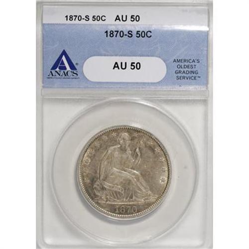 <B>1870-S 50C AU50 ANACS.</B></I> NGC Census: (4/11). PCGS Population (2/20). Mintage: 1,004,000. Numismedia Wsl. Price for NGC/PCGS coin in AU50: $250. (#6329)<BR><BR><B>Coin Engraver:</B> Christian Gobrecht<BR><BR><b>Shipping:</b> Coins & Currency (<a target="_blank" href="http://www.heritageauctions.com/common/shipping.php">view shipping information</a>)