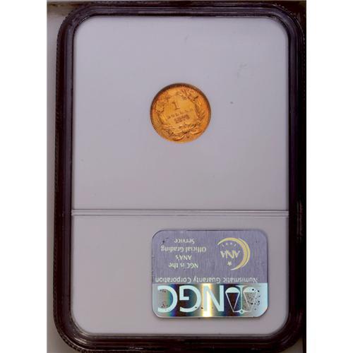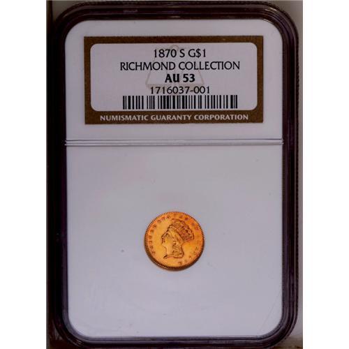 <B>1870-S<G$1> AU53 NGC.</B></I> Ex: Richmond Collection. A pleasing orange-gold example of this scarce S-mint gold dollar that still retains some original luster. Lightly worn with some thin abrasions in the fields.