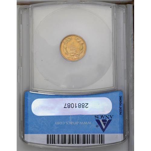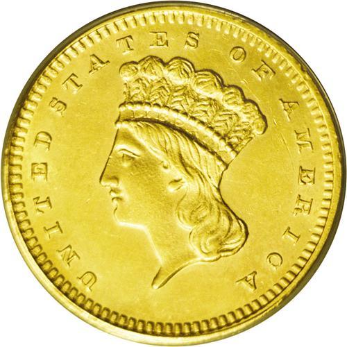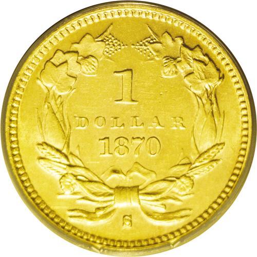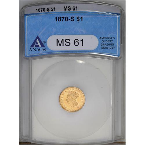 <B>1870-S<G$1> MS61 ANACS.</B></I> This is a pleasing Mint State example with essentially full design elements are pleasing yellow-gold surfaces. Both sides have soft, frosty luster. A few faint hairlines and tiny abrasions are evident, yet the eye appeal is excellent. Only 3,000 of these coins were produced. In fact, the San Francisco Mint had a limited coinage during the year, with a production total of just 50,000 dimes; 1,004,000 half dollars; 3,000 gold dollars; 16,000 quarter eagles; 17,000 half eagles; 8,000 eagles; and 982,000 double eagles. An extremely small and unknown mintage of half dimes, silver dollars, and three dollar gold pieces were also coined.