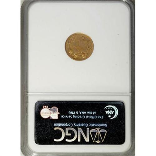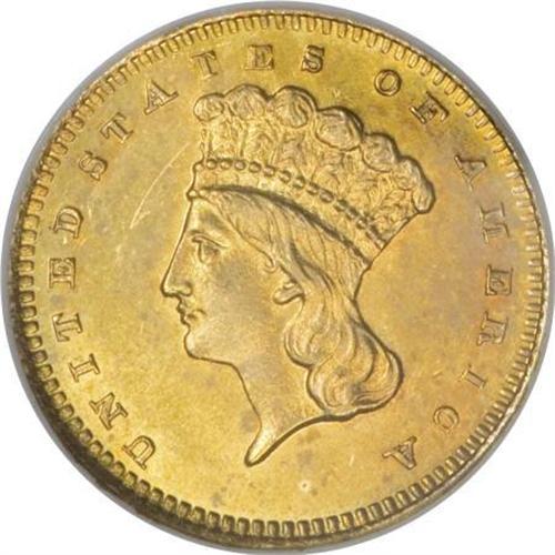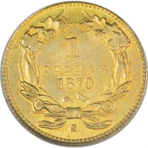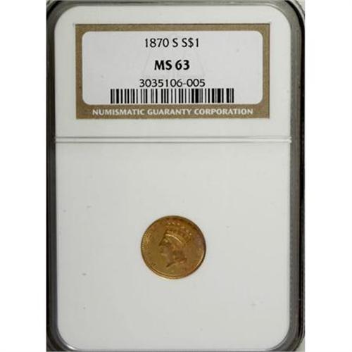 <B>1870-S G$1 MS63 NGC.</B></I> A sharply struck Mint State coin that is graced by the presence of reflective fields and lovely satin luster. Both sides have rich orange-gold color with accents of green and lilac toning. The 1870-S gold dollar is an elusive issue in Mint State grades, rarely seen in grades finer than AU58. NGC has only certified 29 Mint State examples of the date. NGC incorrectly labeled this piece as an 1870-S silver dollar. Census: 4 in 63, 7 finer (12/07).<BR><BR><B>Coin Engraver:</B> James B. Longacre<BR><BR><b>Shipping:</b> Coins & Currency (<a target="_blank" href="http://www.heritageauctions.com/common/shipping.php">view shipping information</a>)