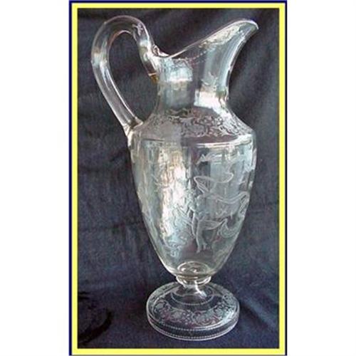 Antique signed engraved glass pitcher. Made in Bohemia (then part of Austrian Empire) by Kamenicky Senov factory and engraved by Karl (Carl) Pietsch (1828 - 1883) and retailed by Lobmeyr company in Vienna. Made circa 1874. <P><P>