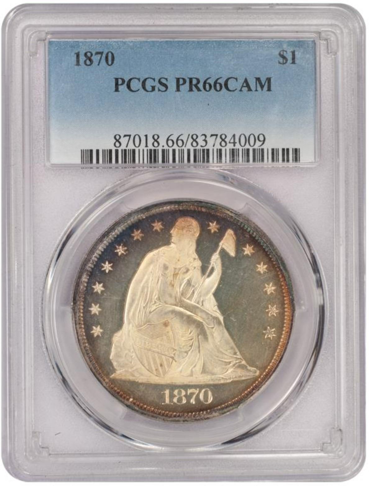 One 1870 Seated Liberty Dollar with Motto PCGS PR66CAM.