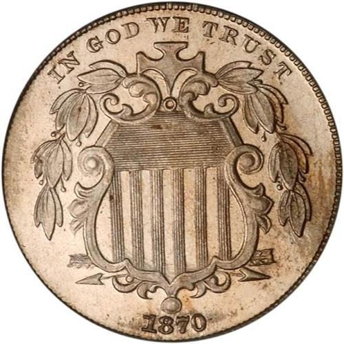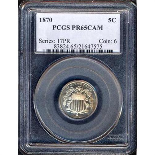 <b>1870 Shield Nickel. PCGS graded PF65 CAM.</b> A fully struck Gem with a light overlay of champagne gold color in a few areas. Close examination reveals deep mirrors, frosty relief, swirling effects, and gem quality survival. Destined for a fine collection. Proof mintage was only 1,000 pieces <b>(PCGS # 83824)</b>