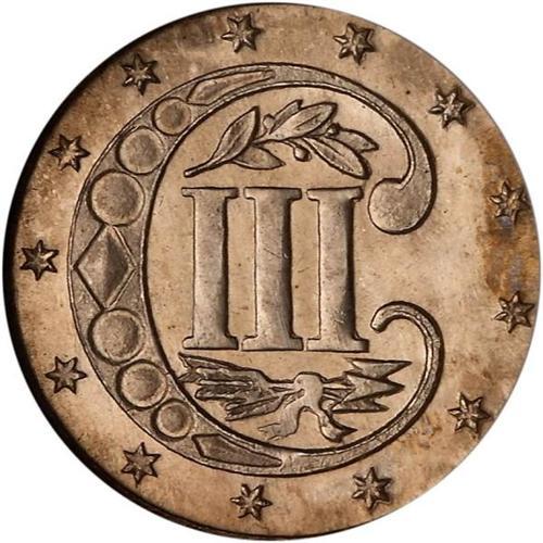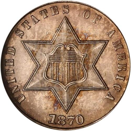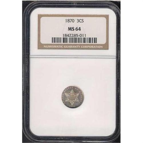 <b>1870 Silver Three Cents. NGC graded MS64.</b> Without doubt the most visually striking feature of this diminutive coin is its soft, frosted mint luster. 1870 is usually represented by a Proof in coin collections, rarely by a circulation strike. Full swirling luster on both sides, in fact. Deficiency also isn't in the cards when it comes to this coin's detail; to put it mildly, outstanding is the word to describe the striking detail on the star and shield, etc. Struck from lightly clashed dies. One reason to own an 1870 3c piece is its low mintage of 3,000 pieces <b>(PCGS # 3691)</b>