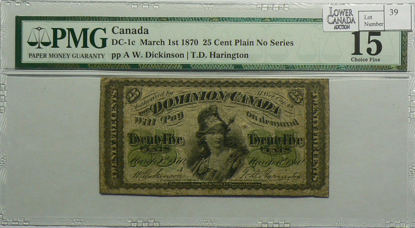 1870 Twenty Five Cents, DC-1a, PMG F-15, Dickinson Harington, Letter A. Identify as DC-1C on the holder but it is a DC-1a.