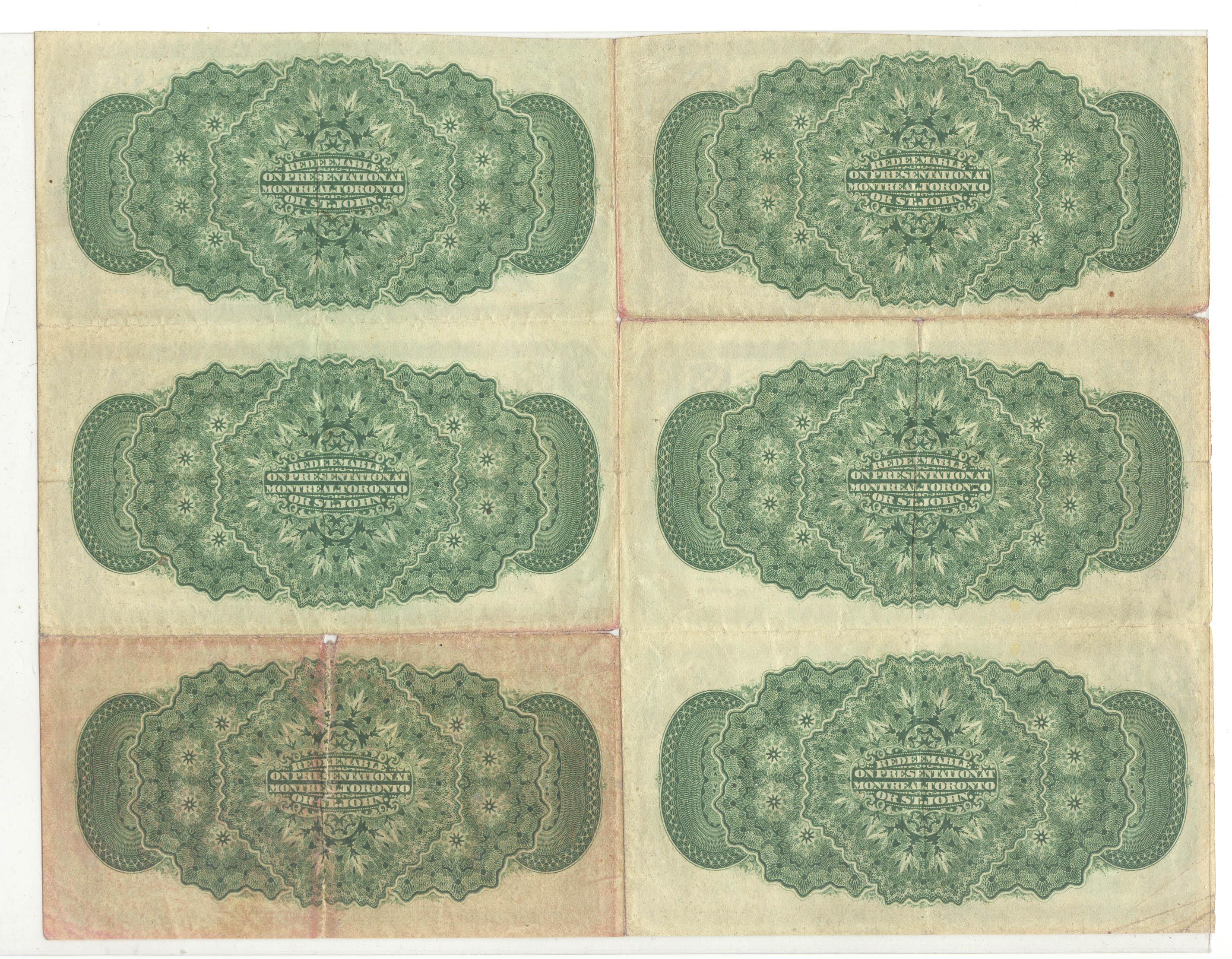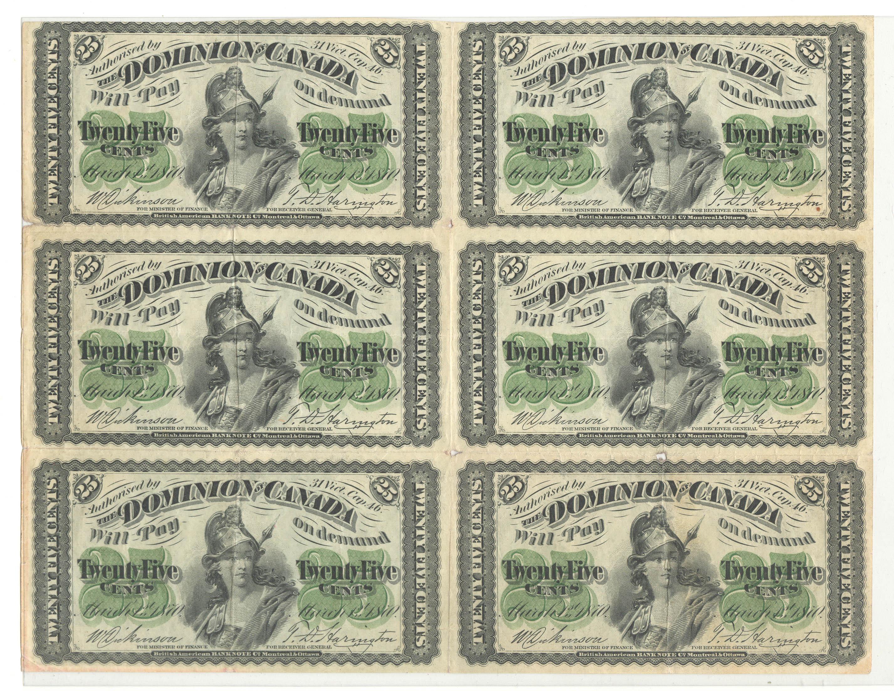 1870 Twenty Five Cents Plain Uncut Sheet of 6, DC-1c, F to VF, Dickinson Harington, few small holes.