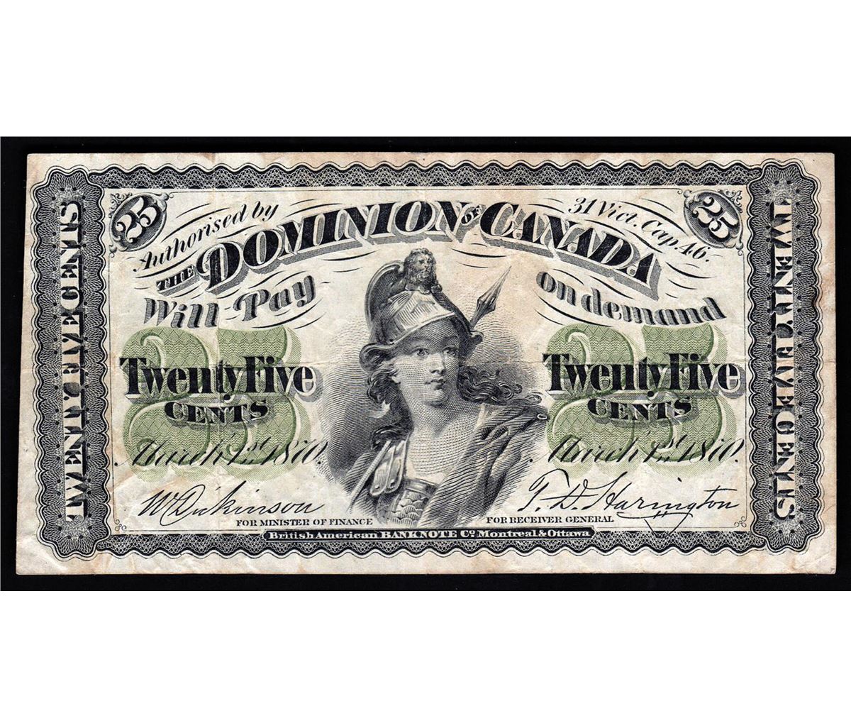 One 1870 Twenty Five Cents The Dominion of Canada Bank Note.