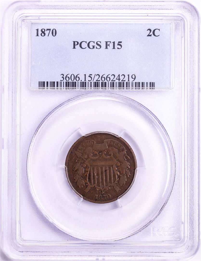 One 1870 Two Cent Piece Coin PCGS F15. PCGS Graded.