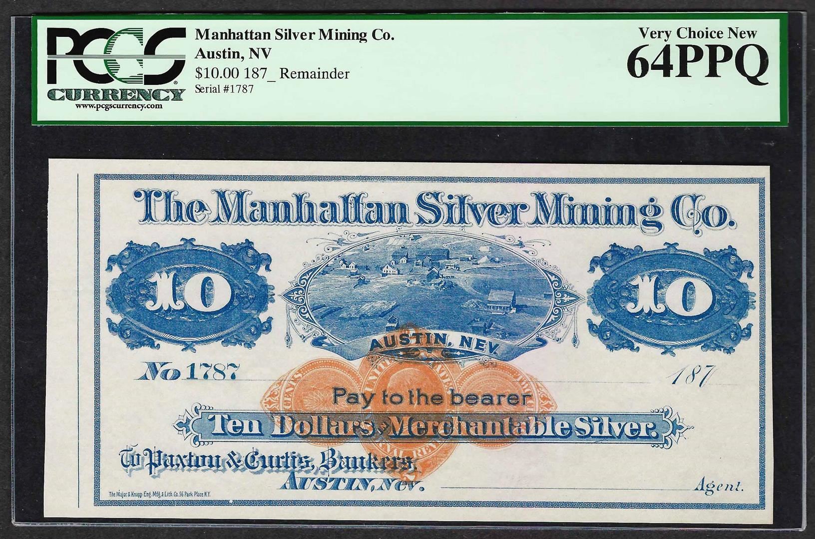 One 1870's $10 Manhattan Silver Mining Co. Obsolete Note PCGS Very Choice New 64PPQ. PCGS Graded.