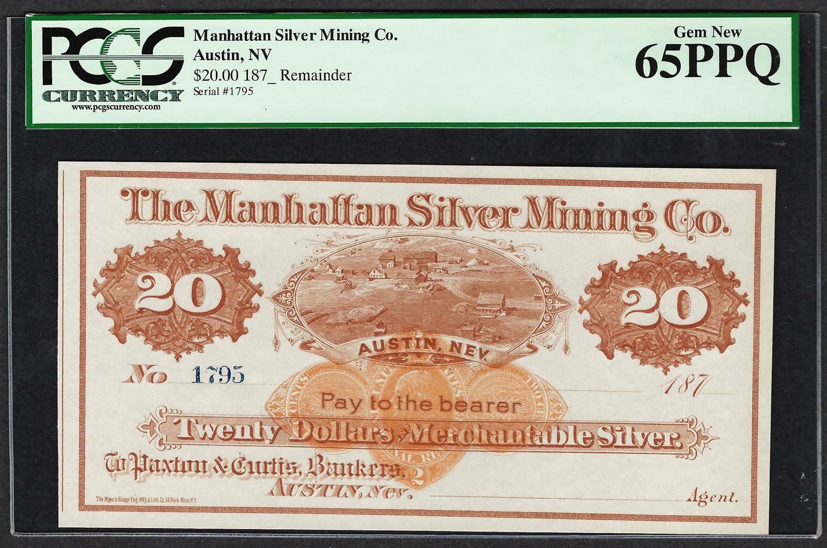 One 1870's $20 Manhattan Silver Mining Co. Obsolete Note PCGS Gem New 65PPQ. PCGS Graded.