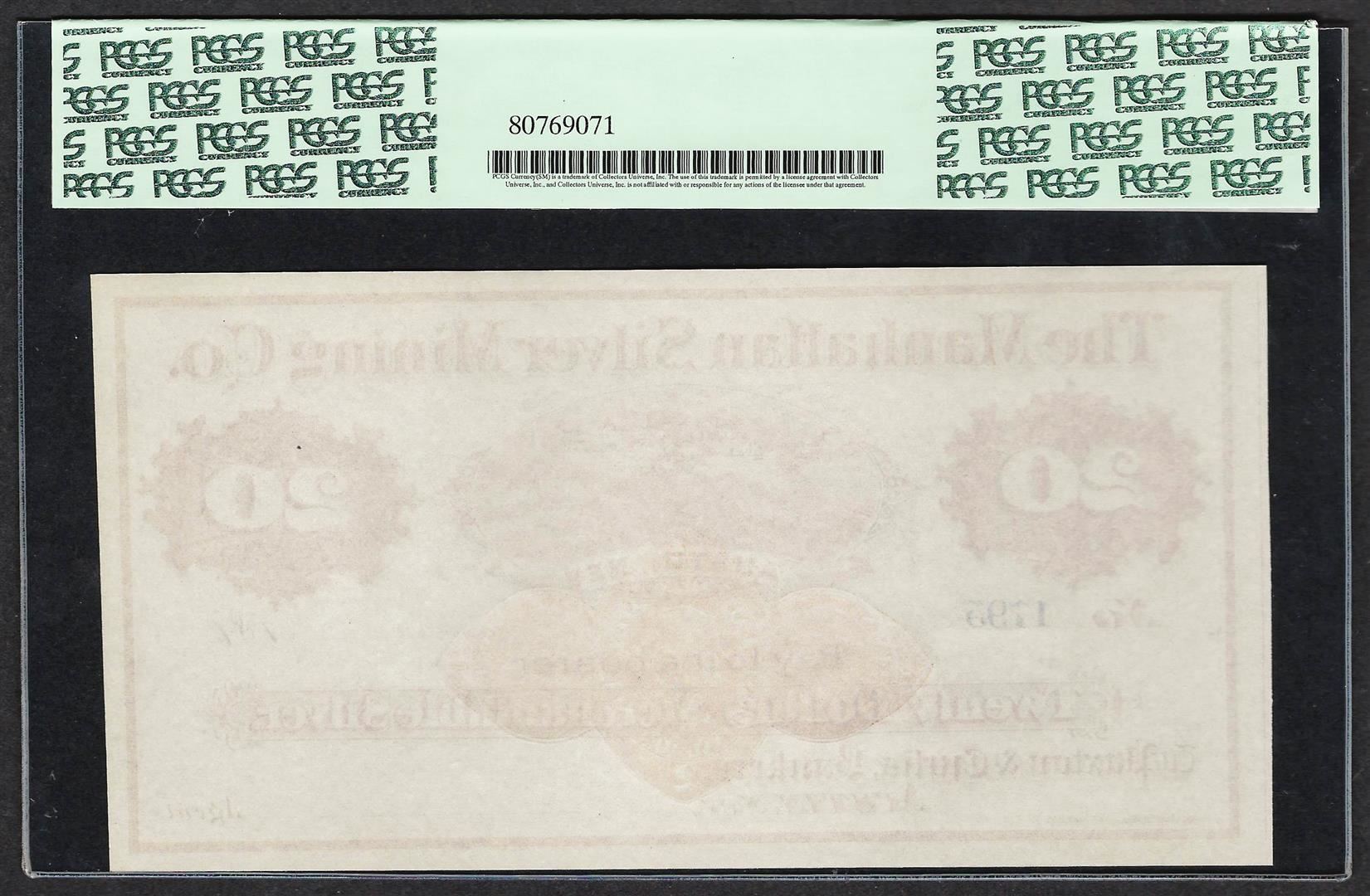 1870's $20 Manhattan Silver Mining Co. Obsolete Note PCGS Gem New 65PPQ