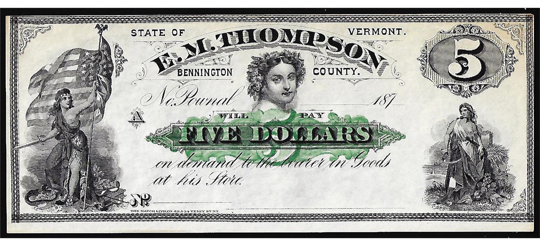 One 1870's $5 E.M. Thompson Obsolete Note.