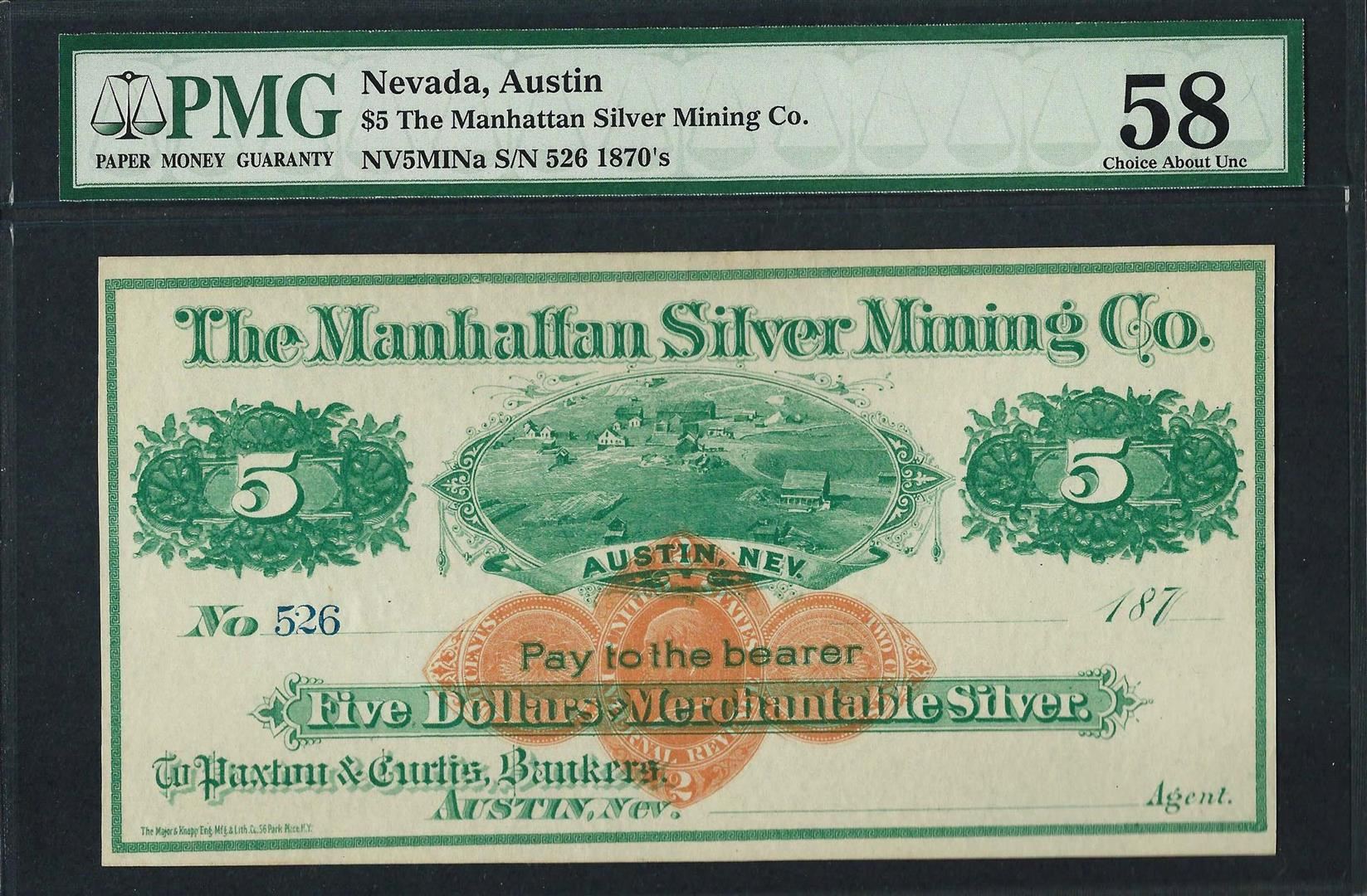 One 1870's $5 Manhattan Silver Mining Co. Obsolete Note PMG Choice About Uncirculated 58. PMG Certified.