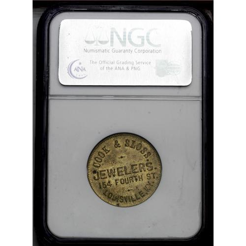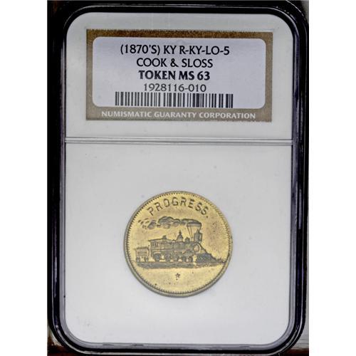 <B>(1870s) Cook & Sloss, R-Ky-Lo-5, Miller Ky-5, Louisville, KY, MS63 NGC.</B></I> Brass. A lustrous green-gold piece. A small spot is on the reverse near 9 o'clock. The obverse is lightly double struck. The reverse does not display doubling, possible if the reverse was the anvil die and the obverse (hammer) die shifted slightly between two strikes.The obverse shows a steaming locomotive with PROGRESS above.<BR><I>From The Troy Wiseman Collection.</B></I>