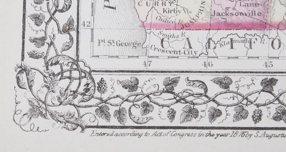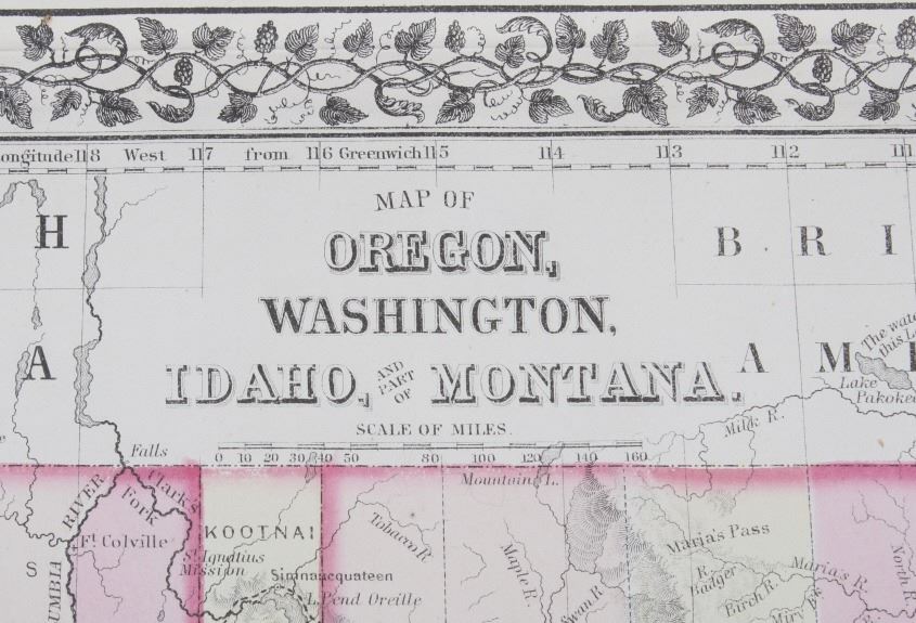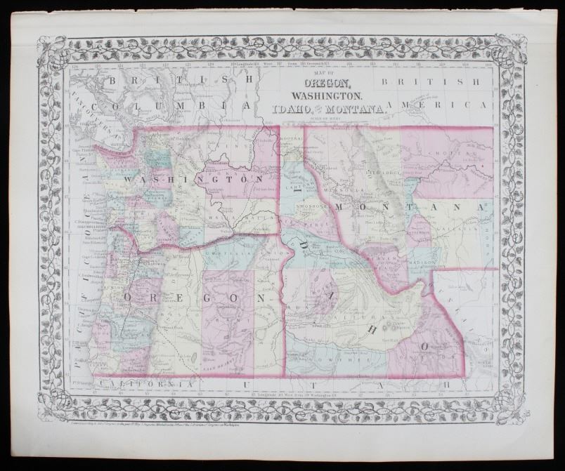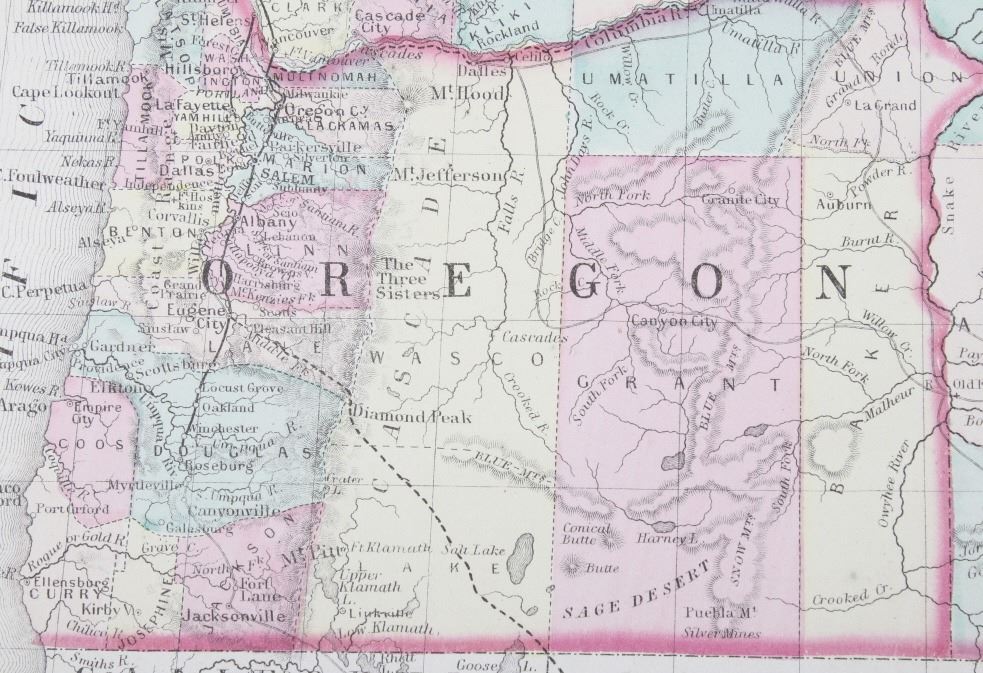 Available in this lot we have a hand tinted map of the Northwest Territories originating from the 1870's. The map details the Northwest territories including Washington, Oregon, Idaho, and most of Montana. The map shows mountain ranges, rivers, lakes, forts, and a few towns and roads. The map is marked across the top reading "Map of Oregon, Washington, Idaho and part of Montana" along with a distance scale. The piece is also marked in the bottom left corner reading "Entered According to Act of Congress in the year 1876 by S Augustus Mitchell in the Office of the Librarian of Congress at Washington". The map shows hand tinted colors across the map designating different regions by color. The piece shows good condition overall and comes with a large page protector. The map itself measures 15 1/4" wide by 12 182" tall.