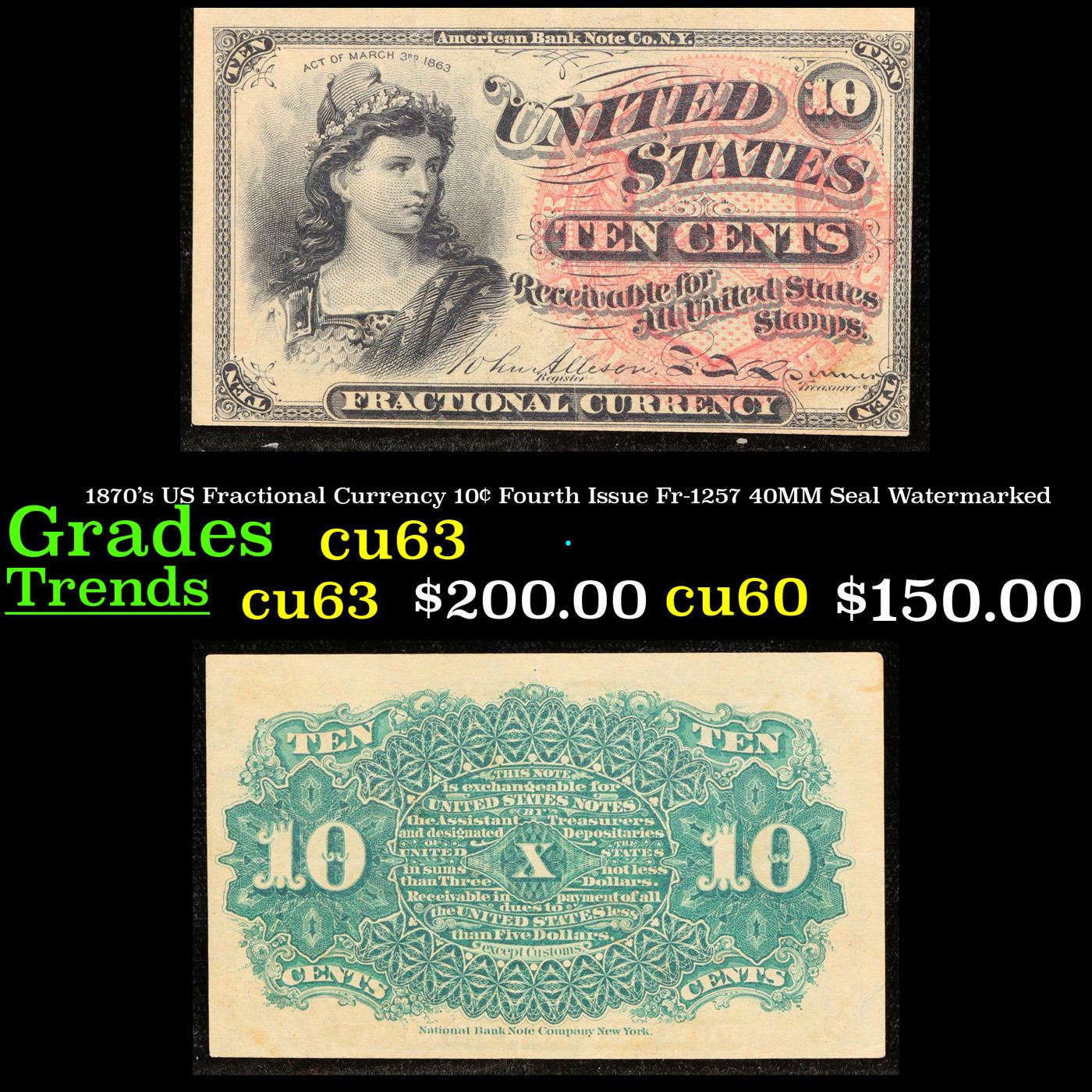 1870's US Fractional Currency 10¢ Fourth Issue Fr-1257 40MM Seal Watermarked Grades Select CU.