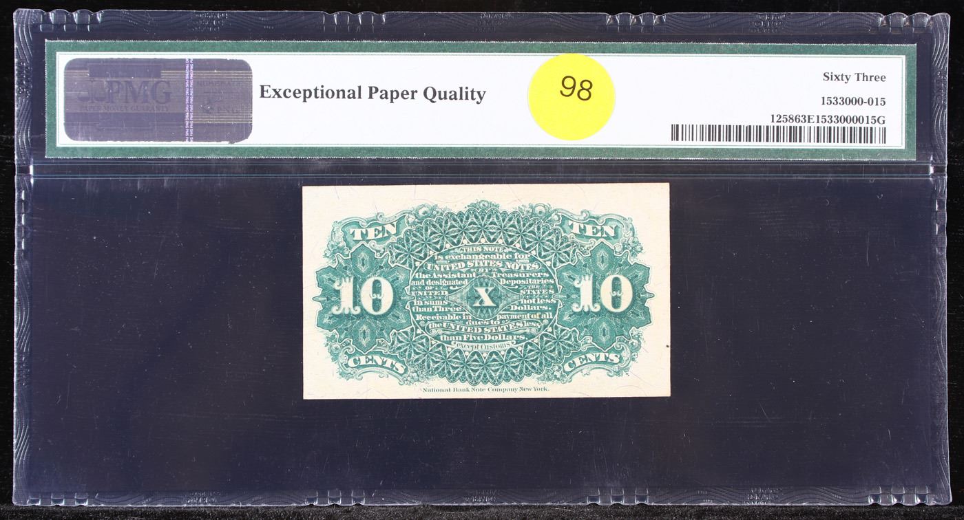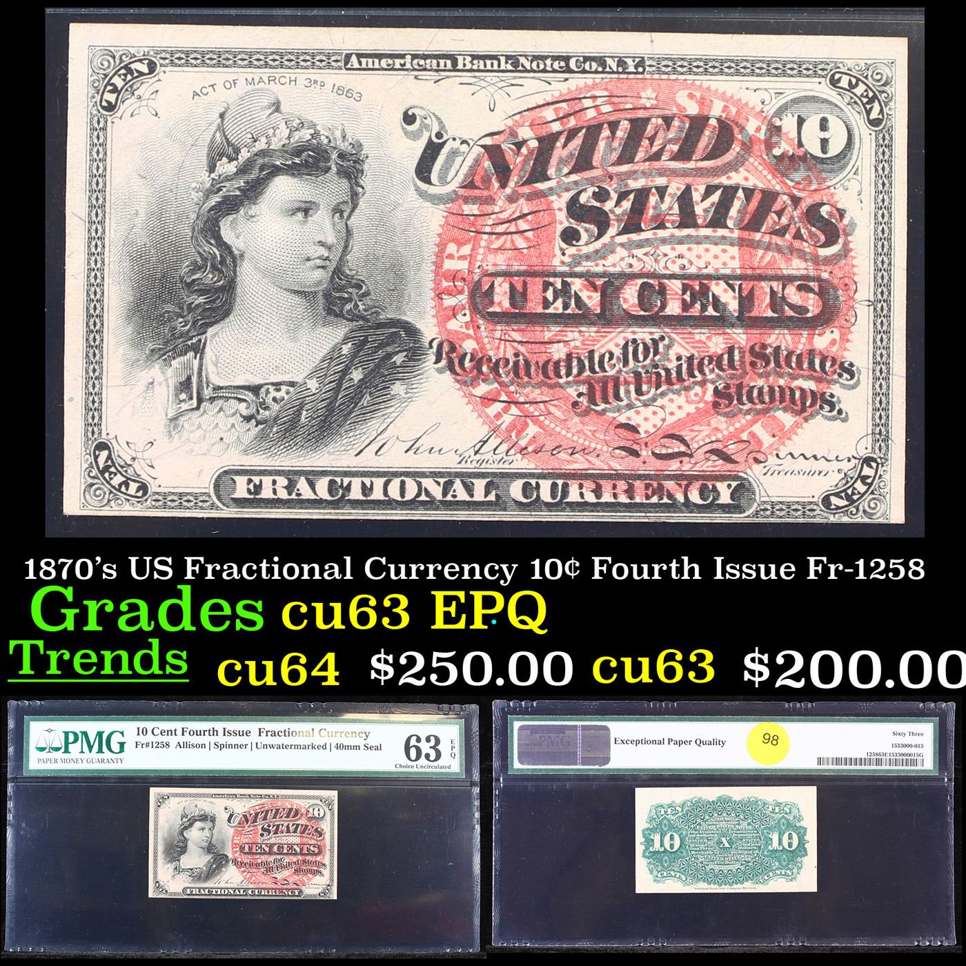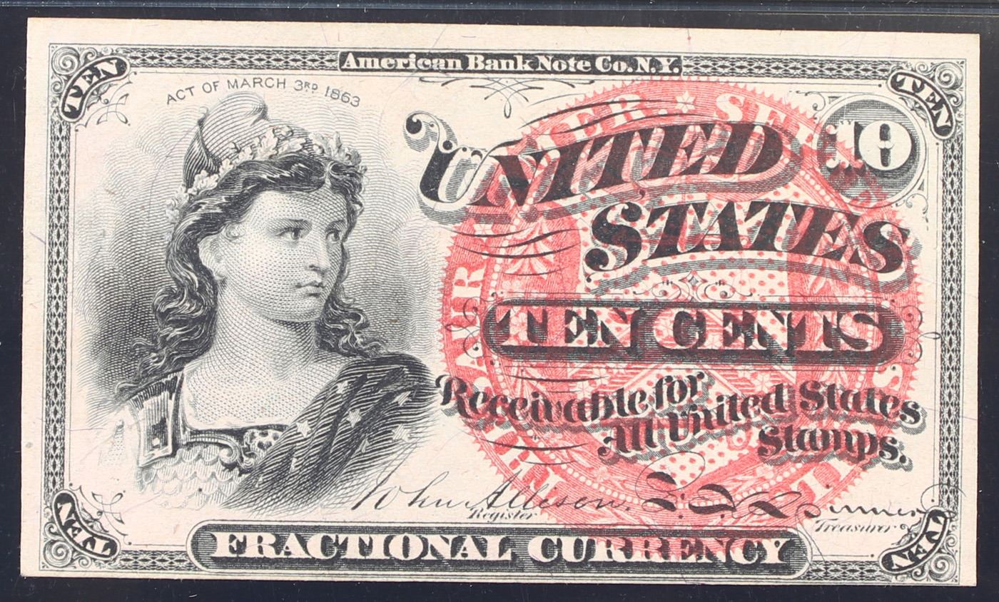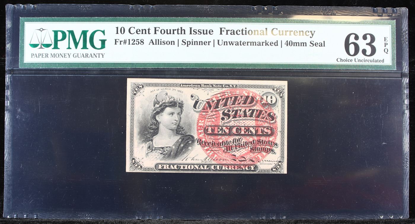 1870's US Fractional Currency 10¢ Fourth Issue Fr-1258 Graded cu63 EPQ By PMG. Fractional or postage currency has a rich history. At the beginning of the Civil War people starting hoarding coins for their precious metal content. Coins became difficult to find because of the hoarding. People started to try to use stamps instead of coins as a means of commerce. The government decided to help ease the hoarding issue by issuing “paper coins” also known as postage currency or fractional currency. Fractional currency was first issued on August 21, 1862 and they were last issued on February 15, 1876. Three cents, five cents, ten cents, twenty-five cents, and fifty cents notes were all issued. Fractional currency is physically smaller than other United States money. It also does not have a serial number.