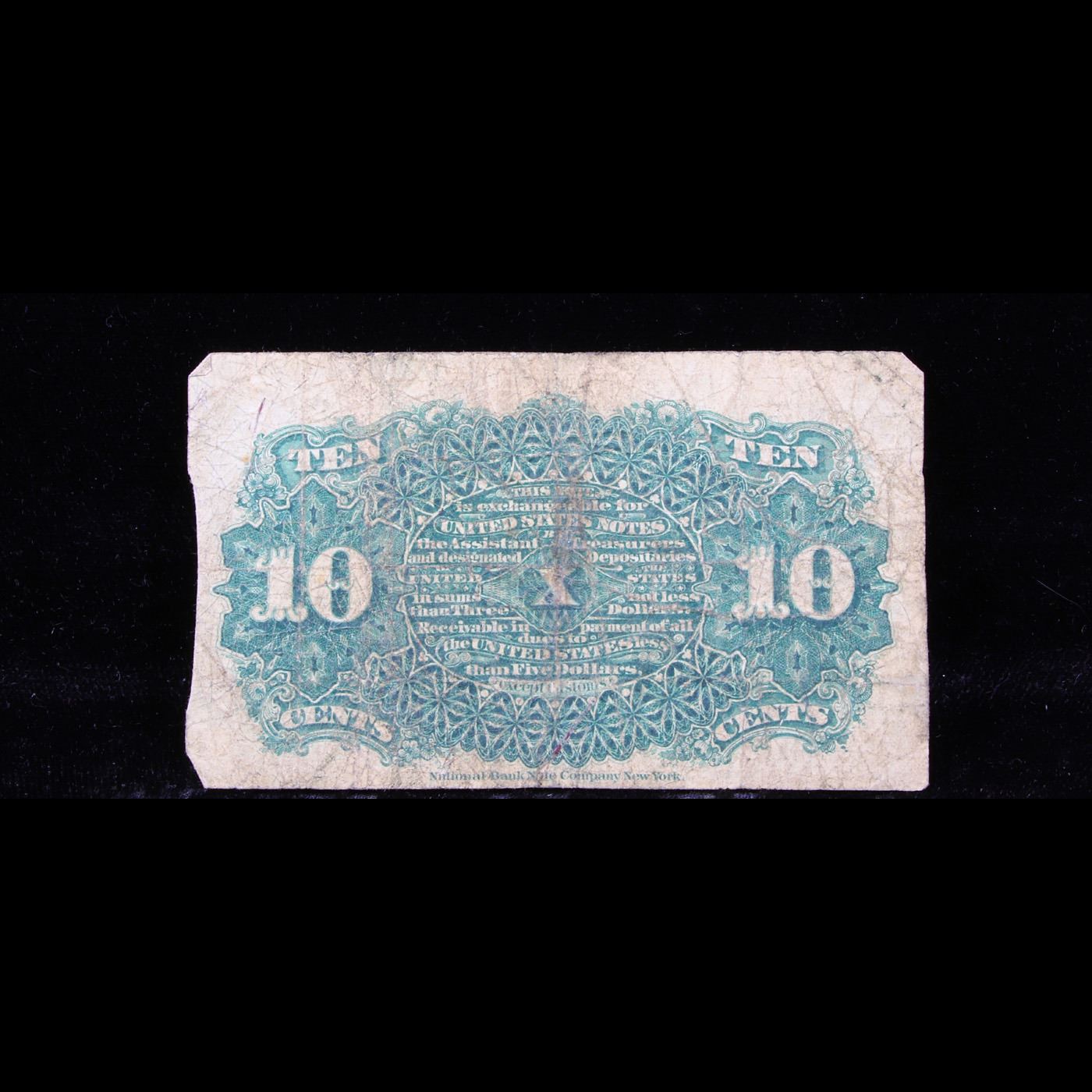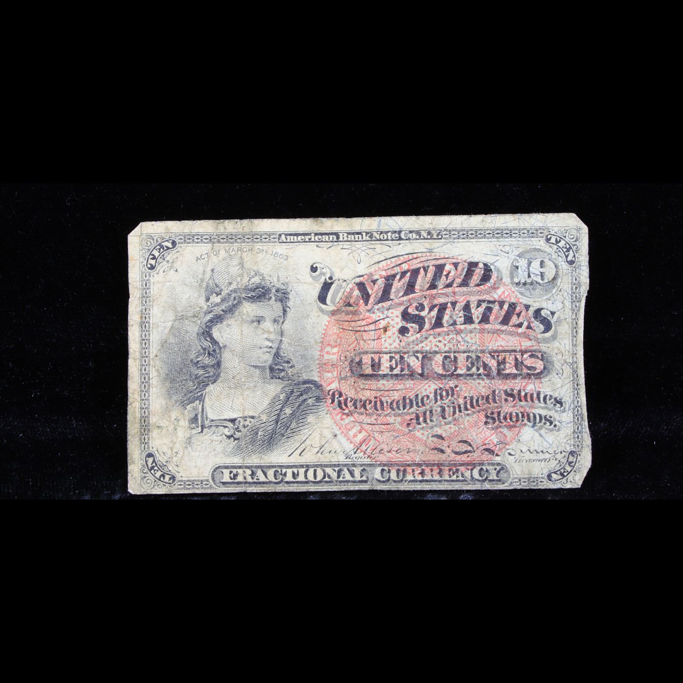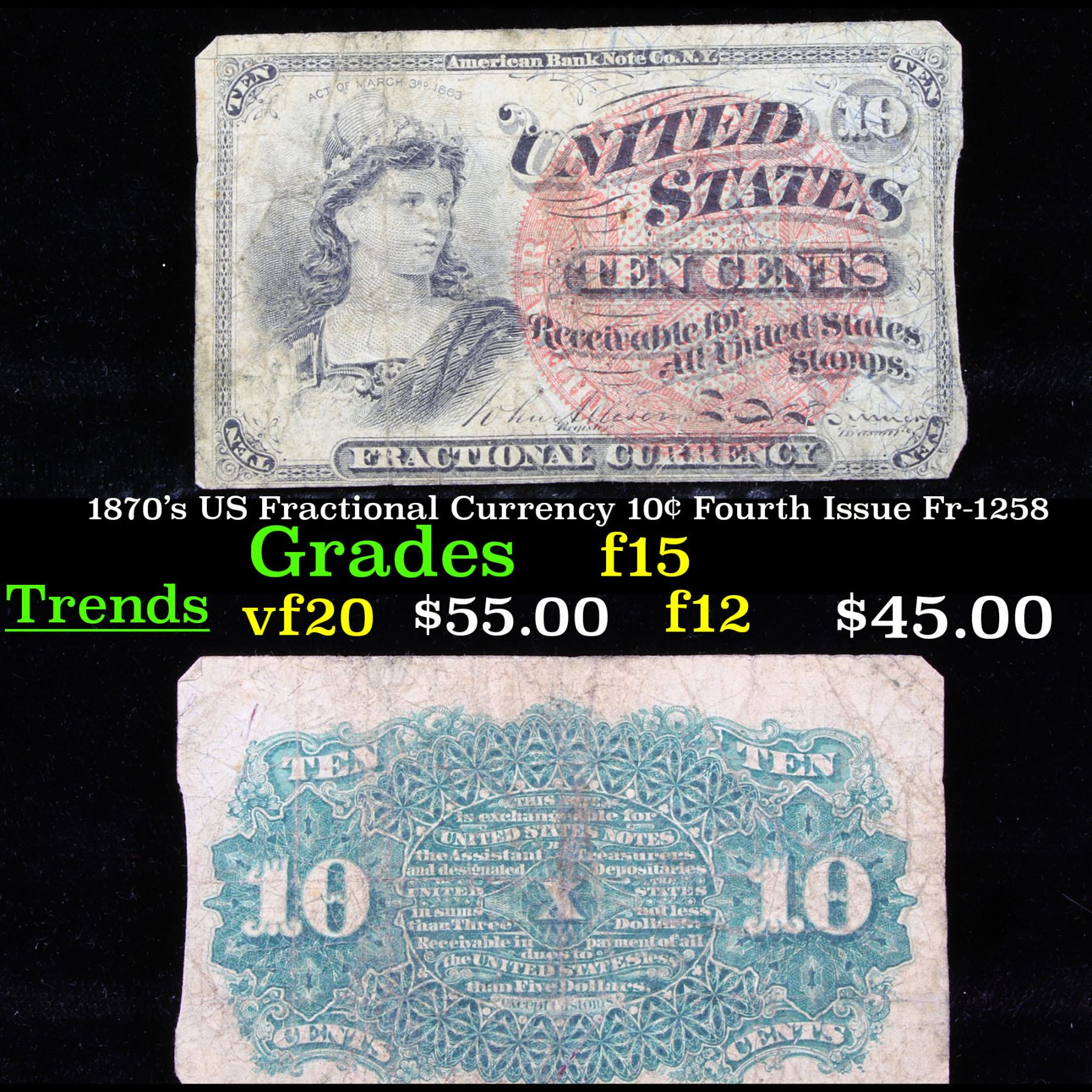 1870's US Fractional Currency 10¢ Fourth Issue Fr-1258 Grades f+. Fractional or postage currency has a rich history. At the beginning of the Civil War people starting hoarding coins for their precious metal content. Coins became difficult to find because of the hoarding. People started to try to use stamps instead of coins as a means of commerce. The government decided to help ease the hoarding issue by issuing “paper coins” also known as postage currency or fractional currency. Fractional currency was first issued on August 21, 1862 and they were last issued on February 15, 1876. Three cents, five cents, ten cents, twenty-five cents, and fifty cents notes were all issued. Fractional currency is physically smaller than other United States money. It also does not have a serial number.