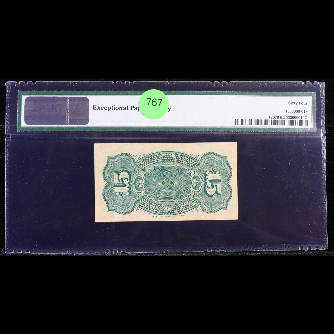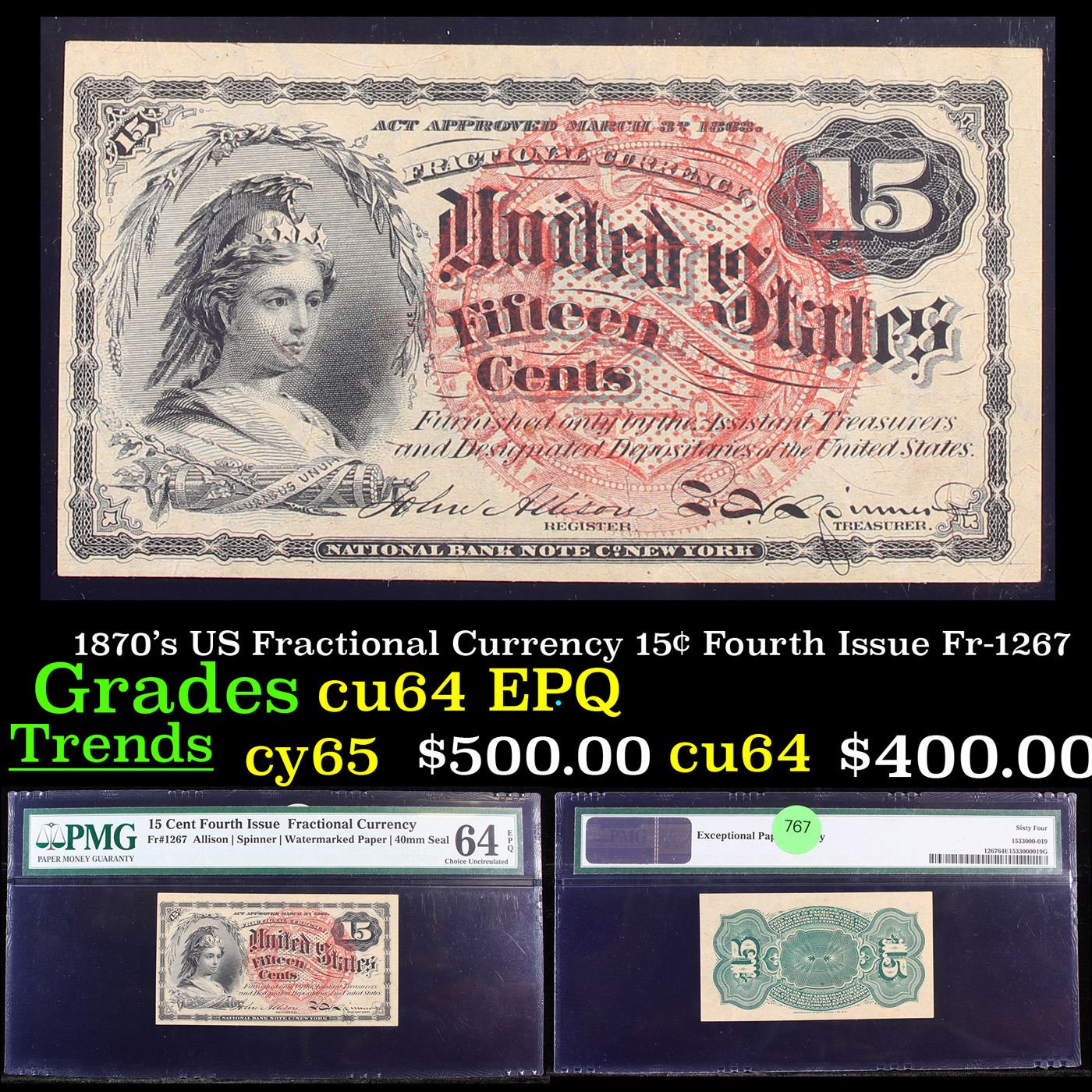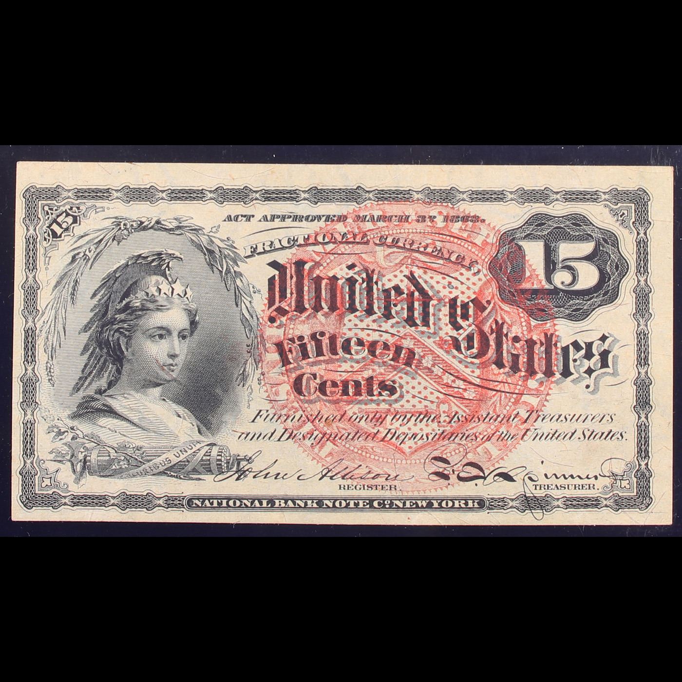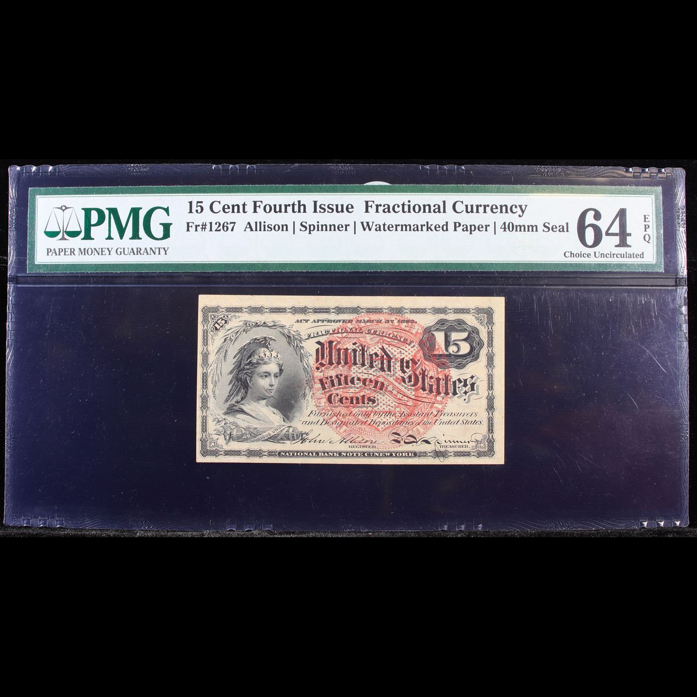1870's US Fractional Currency 15¢ Fourth Issue Fr-1267 Graded cu64 EPQ By PMG. Fractional or postage currency has a rich history. At the beginning of the Civil War people starting hoarding coins for their precious metal content. Coins became difficult to find because of the hoarding. People started to try to use stamps instead of coins as a means of commerce. The government decided to help ease the hoarding issue by issuing “paper coins” also known as postage currency or fractional currency. Fractional currency was first issued on August 21, 1862 and they were last issued on February 15, 1876. Three cents, five cents, ten cents, twenty-five cents, and fifty cents notes were all issued. Fractional currency is physically smaller than other United States money. It also does not have a serial number.