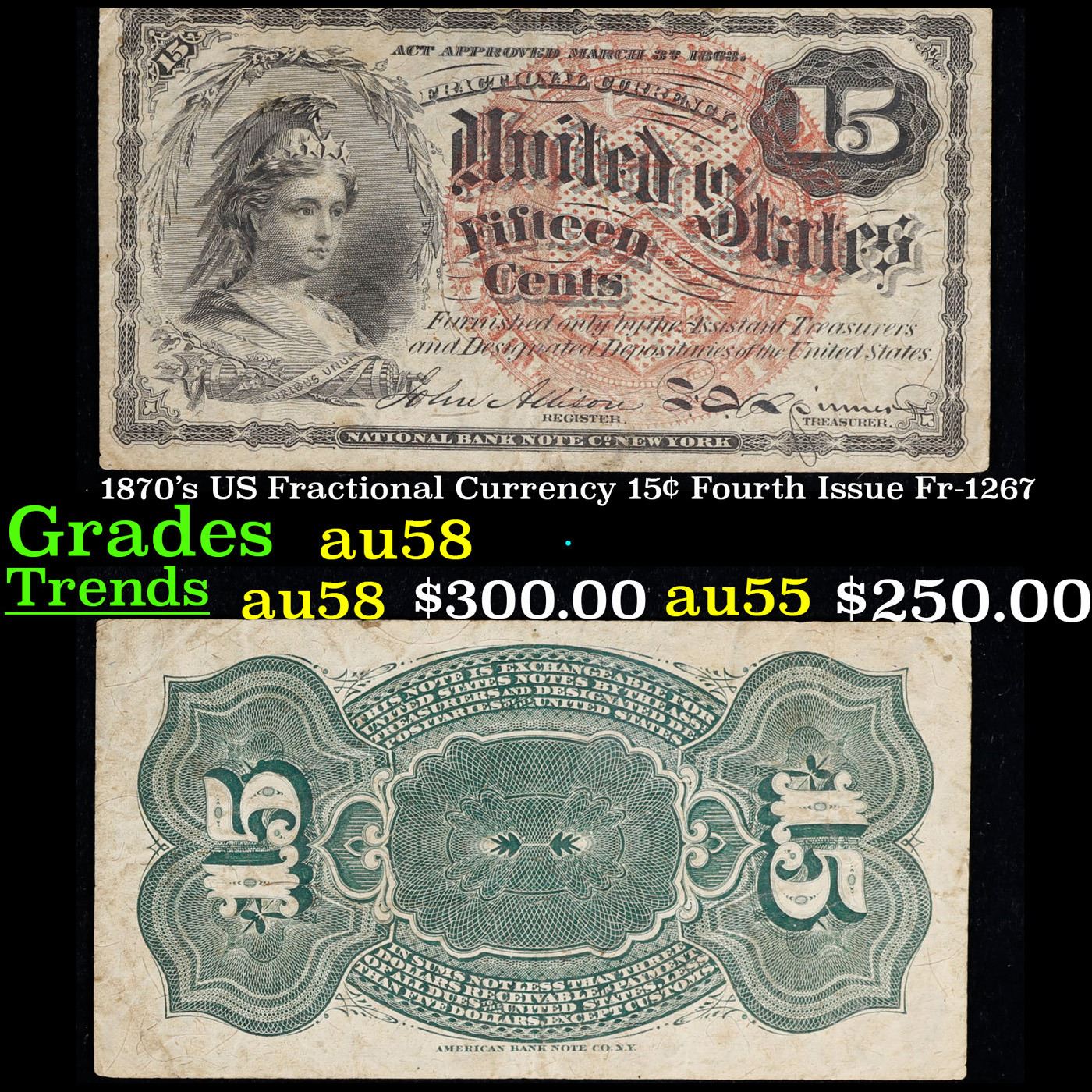1870's US Fractional Currency 15¢ Fourth Issue Fr-1267 Grades Choice AU/BU Slider. Fractional or postage currency has a rich history. At the beginning of the Civil War people starting hoarding coins for their precious metal content. Coins became difficult to find because of the hoarding. People started to try to use stamps instead of coins as a means of commerce. The government decided to help ease the hoarding issue by issuing “paper coins” also known as postage currency or fractional currency. Fractional currency was first issued on August 21, 1862 and they were last issued on February 15, 1876. Three cents, five cents, ten cents, twenty-five cents, and fifty cents notes were all issued. Fractional currency is physically smaller than other United States money. It also does not have a serial number.