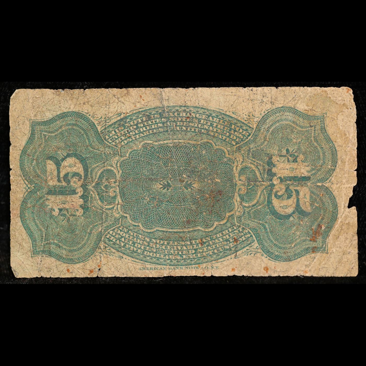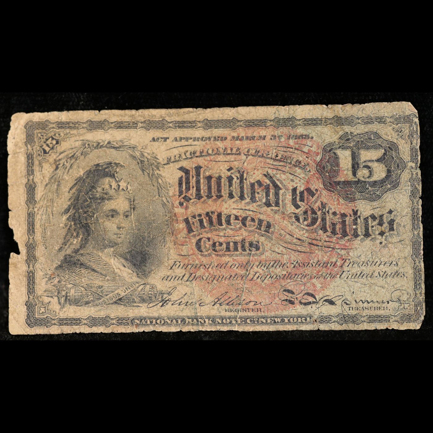 1870's US Fractional Currency 15¢ Fourth Issue Fr-1267 Grades f, fine. Fractional or postage currency has a rich history. At the beginning of the Civil War people starting hoarding coins for their precious metal content. Coins became difficult to find because of the hoarding. People started to try to use stamps instead of coins as a means of commerce. The government decided to help ease the hoarding issue by issuing “paper coins” also known as postage currency or fractional currency. Fractional currency was first issued on August 21, 1862 and they were last issued on February 15, 1876. Three cents, five cents, ten cents, twenty-five cents, and fifty cents notes were all issued. Fractional currency is physically smaller than other United States money. It also does not have a serial number.