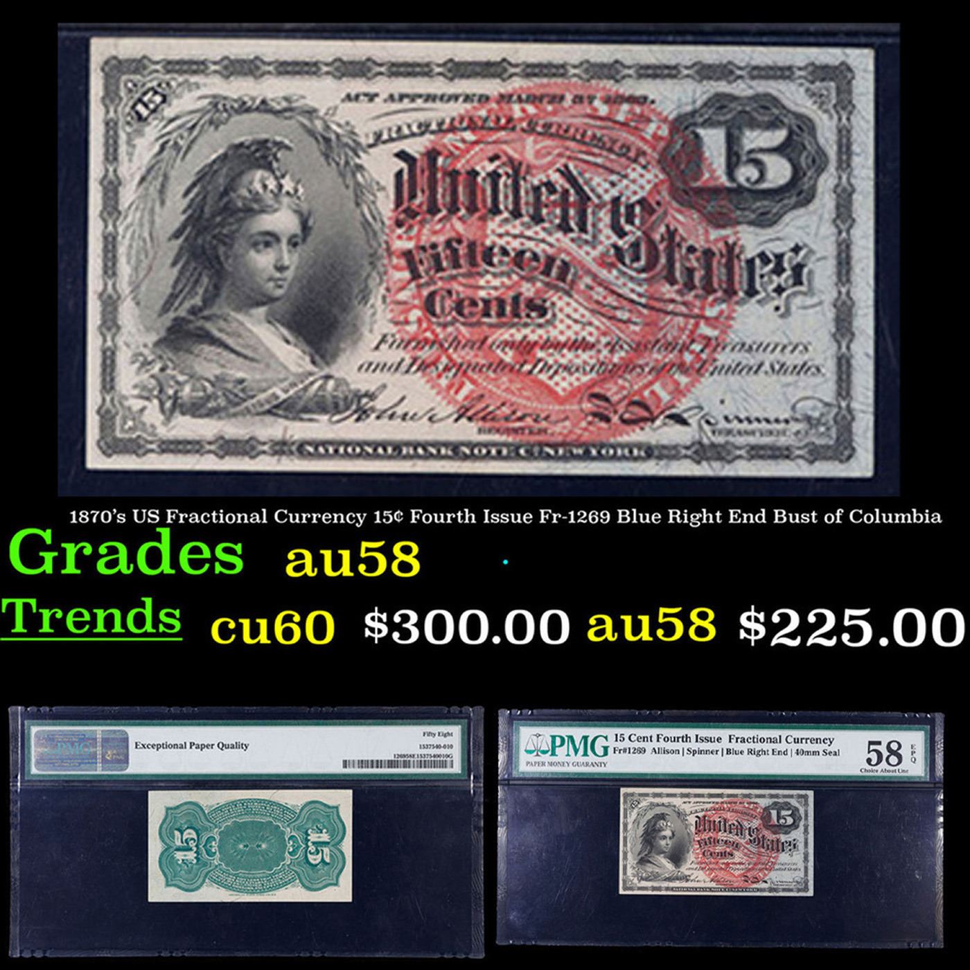 1870's US Fractional Currency 15¢ Fourth Issue Fr-1269 Blue Right End Bust of Columbia Graded au58 B