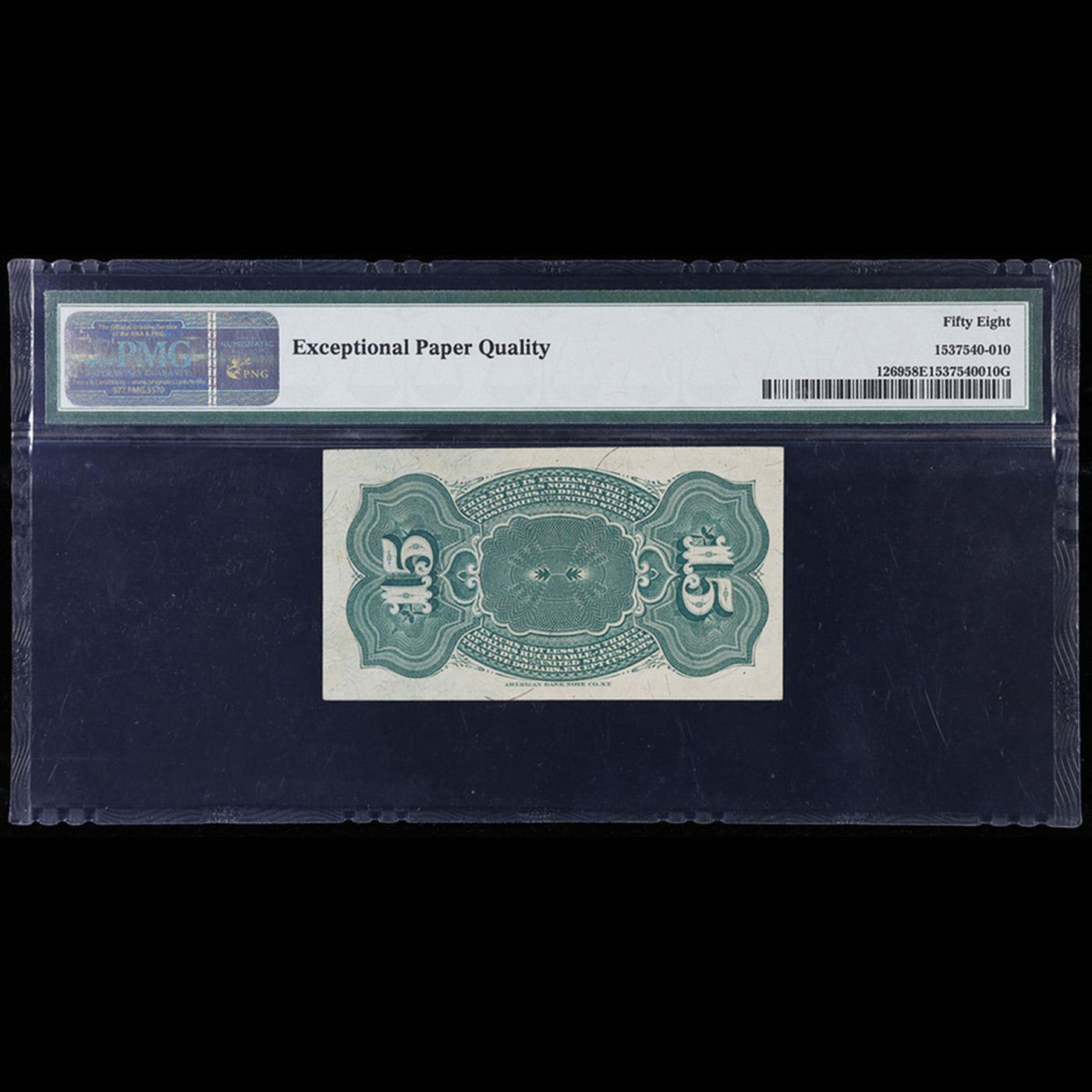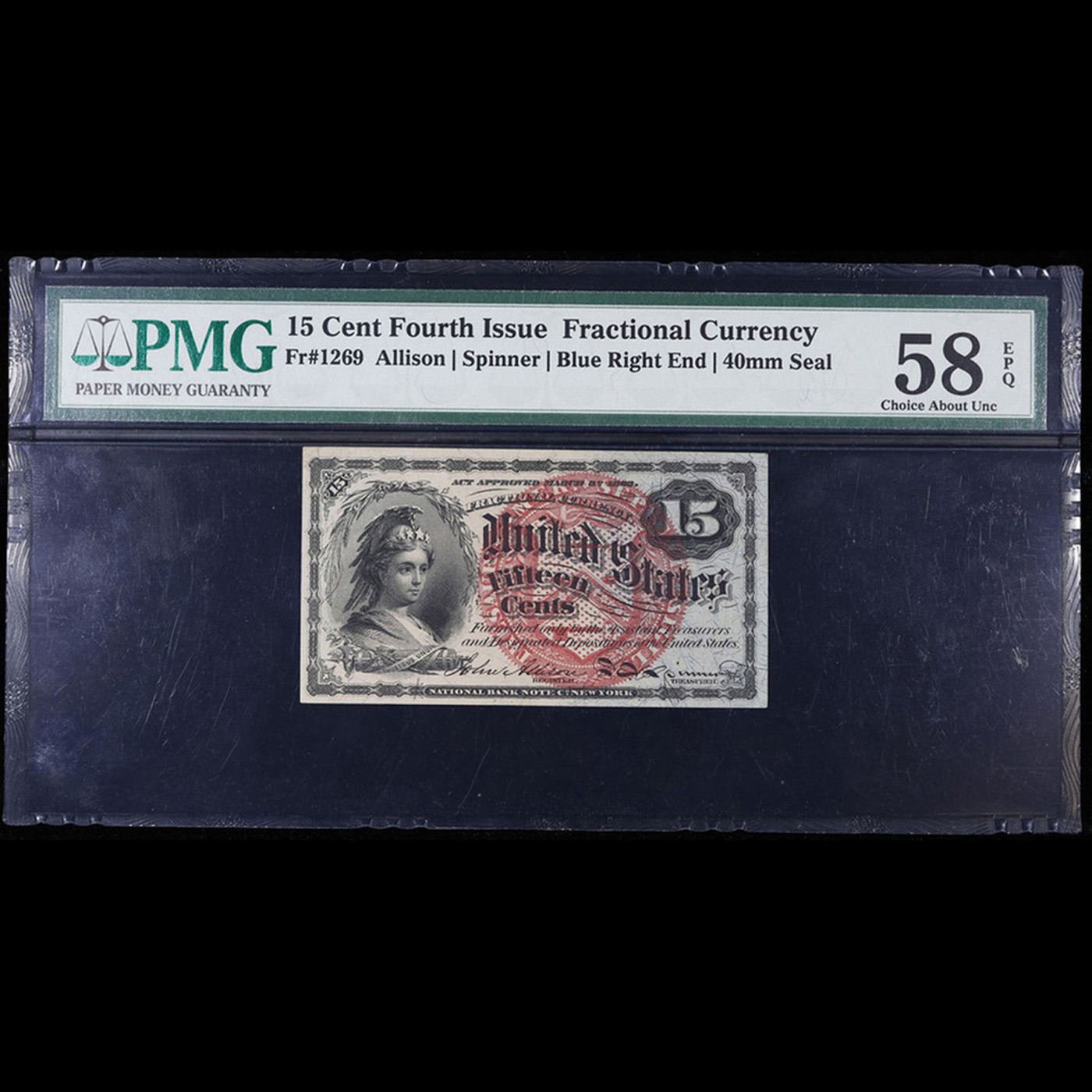1870's US Fractional Currency 15¢ Fourth Issue Fr-1269 Blue Right End Bust of Columbia Graded au58 By PMG. Fractional or postage currency has a rich history. At the beginning of the Civil War people starting hoarding coins for their precious metal content. Coins became difficult to find because of the hoarding. People started to try to use stamps instead of coins as a means of commerce. The government decided to help ease the hoarding issue by issuing “paper coins” also known as postage currency or fractional currency. Fractional currency was first issued on August 21, 1862 and they were last issued on February 15, 1876. Three cents, five cents, ten cents, twenty-five cents, and fifty cents notes were all issued. Fractional currency is physically smaller than other United States money. It also does not have a serial number.