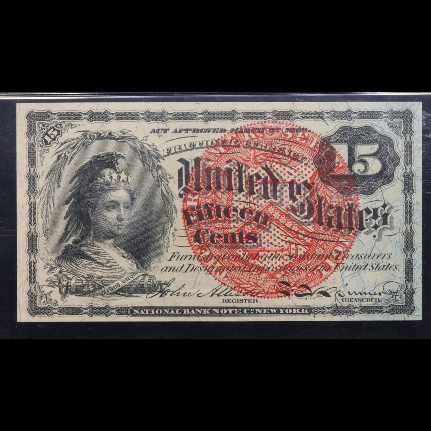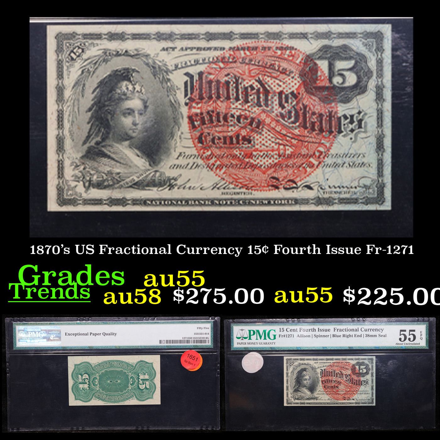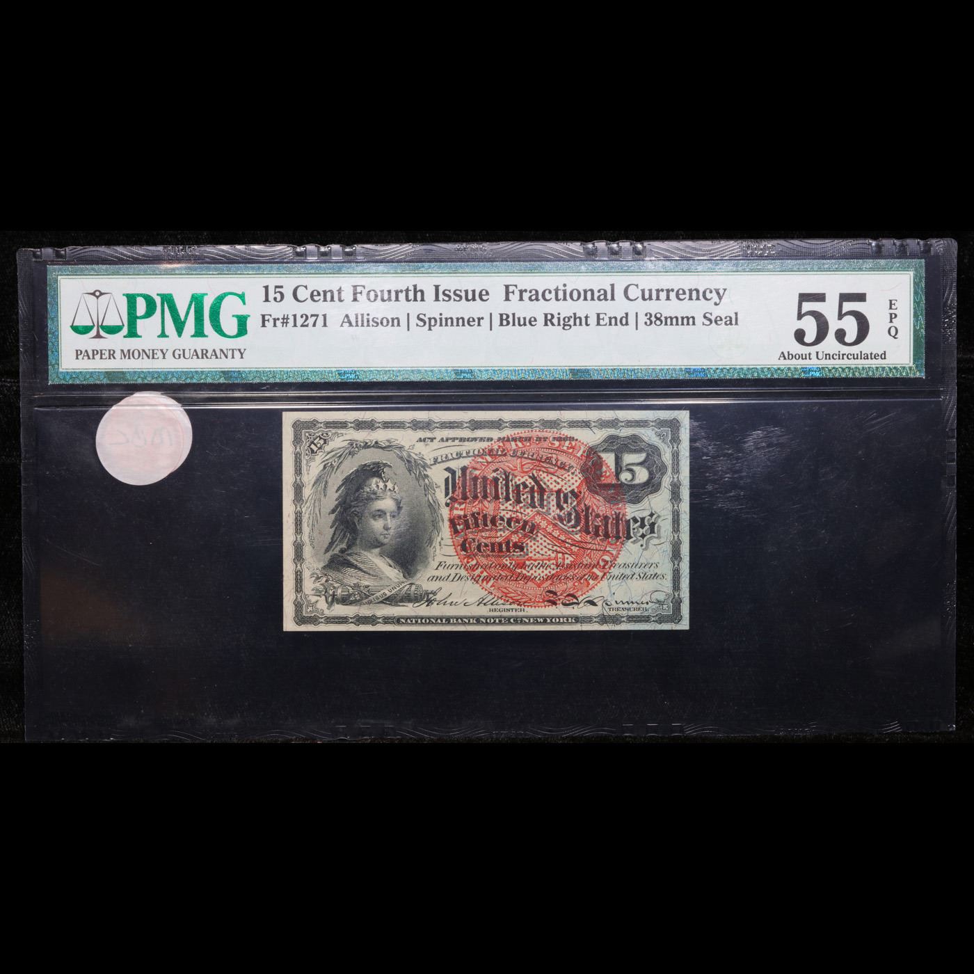 1870's US Fractional Currency 15¢ Fourth Issue Fr-1271 Graded au55 EPQ By PMG. Fractional or postage currency has a rich history. At the beginning of the Civil War people starting hoarding coins for their precious metal content. Coins became difficult to find because of the hoarding. People started to try to use stamps instead of coins as a means of commerce. The government decided to help ease the hoarding issue by issuing “paper coins” also known as postage currency or fractional currency. Fractional currency was first issued on August 21, 1862 and they were last issued on February 15, 1876. Three cents, five cents, ten cents, twenty-five cents, and fifty cents notes were all issued. Fractional currency is physically smaller than other United States money. It also does not have a serial number.