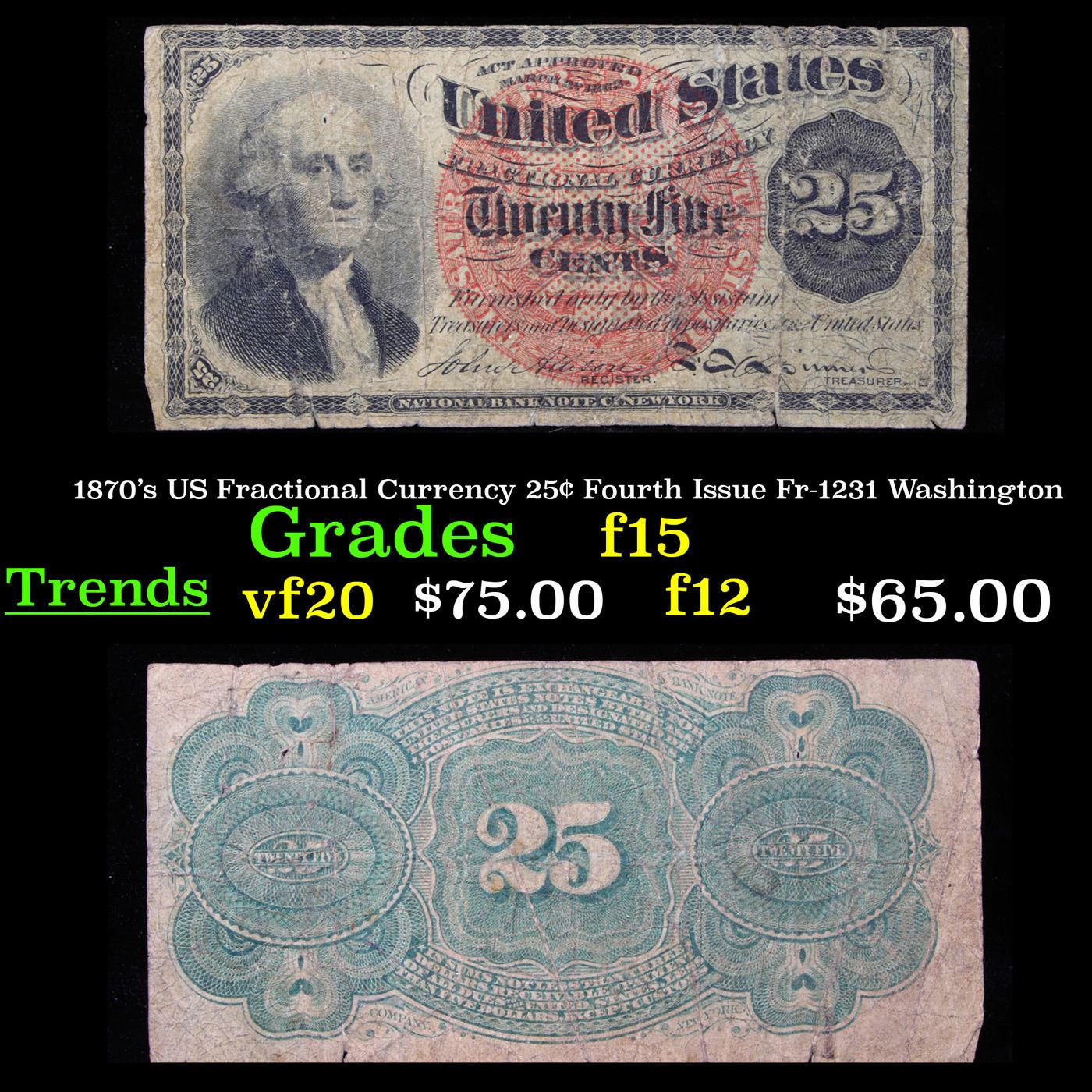 1870's US Fractional Currency 25¢ Fourth Issue Fr-1231 Washington Grades f+. Fractional or postage currency has a rich history. At the beginning of the Civil War people starting hoarding coins for their precious metal content. Coins became difficult to find because of the hoarding. People started to try to use stamps instead of coins as a means of commerce. The government decided to help ease the hoarding issue by issuing “paper coins” also known as postage currency or fractional currency. Fractional currency was first issued on August 21, 1862 and they were last issued on February 15, 1876. Three cents, five cents, ten cents, twenty-five cents, and fifty cents notes were all issued. Fractional currency is physically smaller than other United States money. It also does not have a serial number.