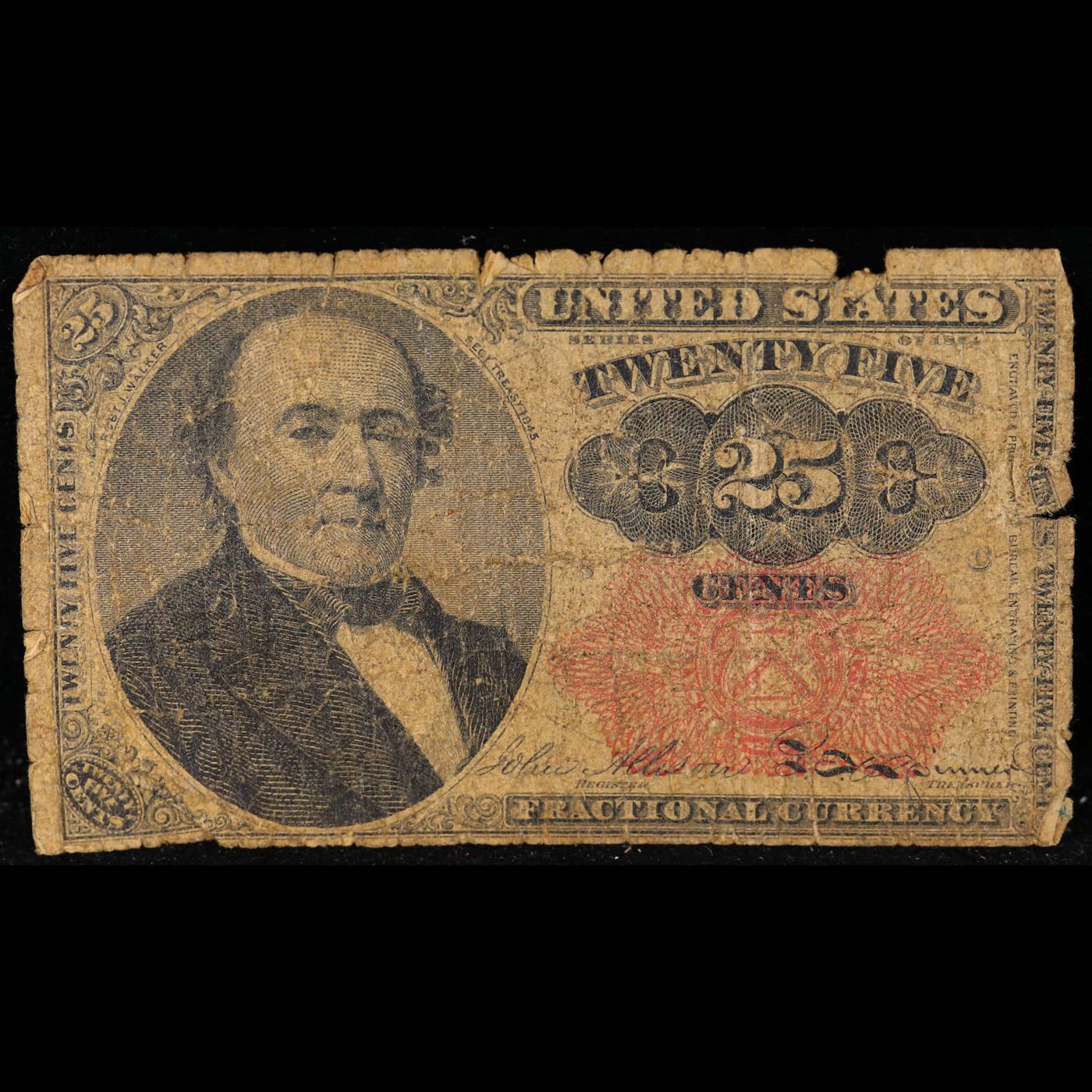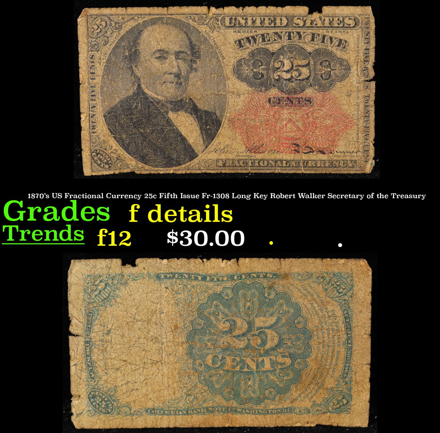 1870's US Fractional Currency 25c Fifth Issue Fr-1308 Long Key Robert Walker Secretary of the Treasury Grades f details. Fractional or postage currency has a rich history. At the beginning of the Civil War people starting hoarding coins for their precious metal content. Coins became difficult to find because of the hoarding. People started to try to use stamps instead of coins as a means of commerce. The government decided to help ease the hoarding issue by issuing “paper coins” also known as postage currency or fractional currency. Fractional currency was first issued on August 21, 1862 and they were last issued on February 15, 1876. Three cents, five cents, ten cents, twenty-five cents, and fifty cents notes were all issued. Fractional currency is physically smaller than other United States money. It also does not have a serial number. William Meredith is pictured on the front.