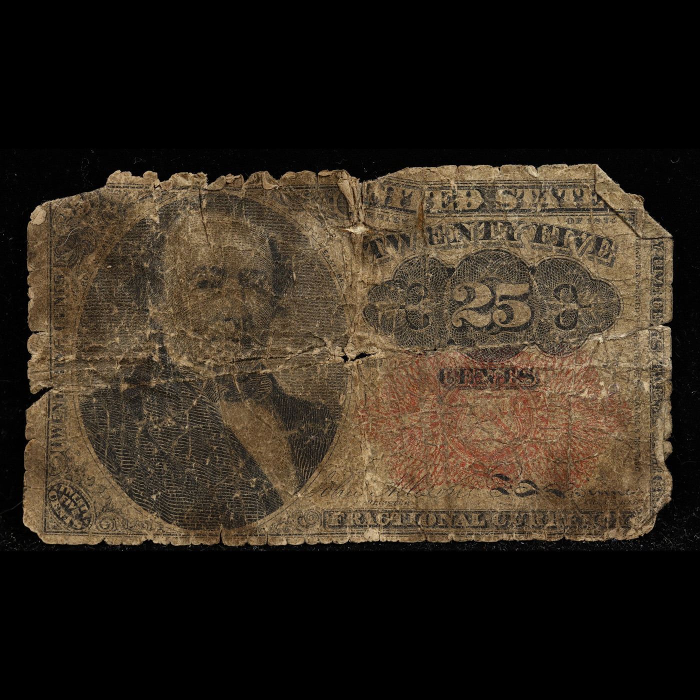 1870's US Fractional Currency 25c Fifth Issue Fr-1308 Long Key Robert Walker Secretary of the Treasury Grades g details. Fractional or postage currency has a rich history. At the beginning of the Civil War people starting hoarding coins for their precious metal content. Coins became difficult to find because of the hoarding. People started to try to use stamps instead of coins as a means of commerce. The government decided to help ease the hoarding issue by issuing “paper coins” also known as postage currency or fractional currency. Fractional currency was first issued on August 21, 1862 and they were last issued on February 15, 1876. Three cents, five cents, ten cents, twenty-five cents, and fifty cents notes were all issued. Fractional currency is physically smaller than other United States money. It also does not have a serial number. William Meredith is pictured on the front.