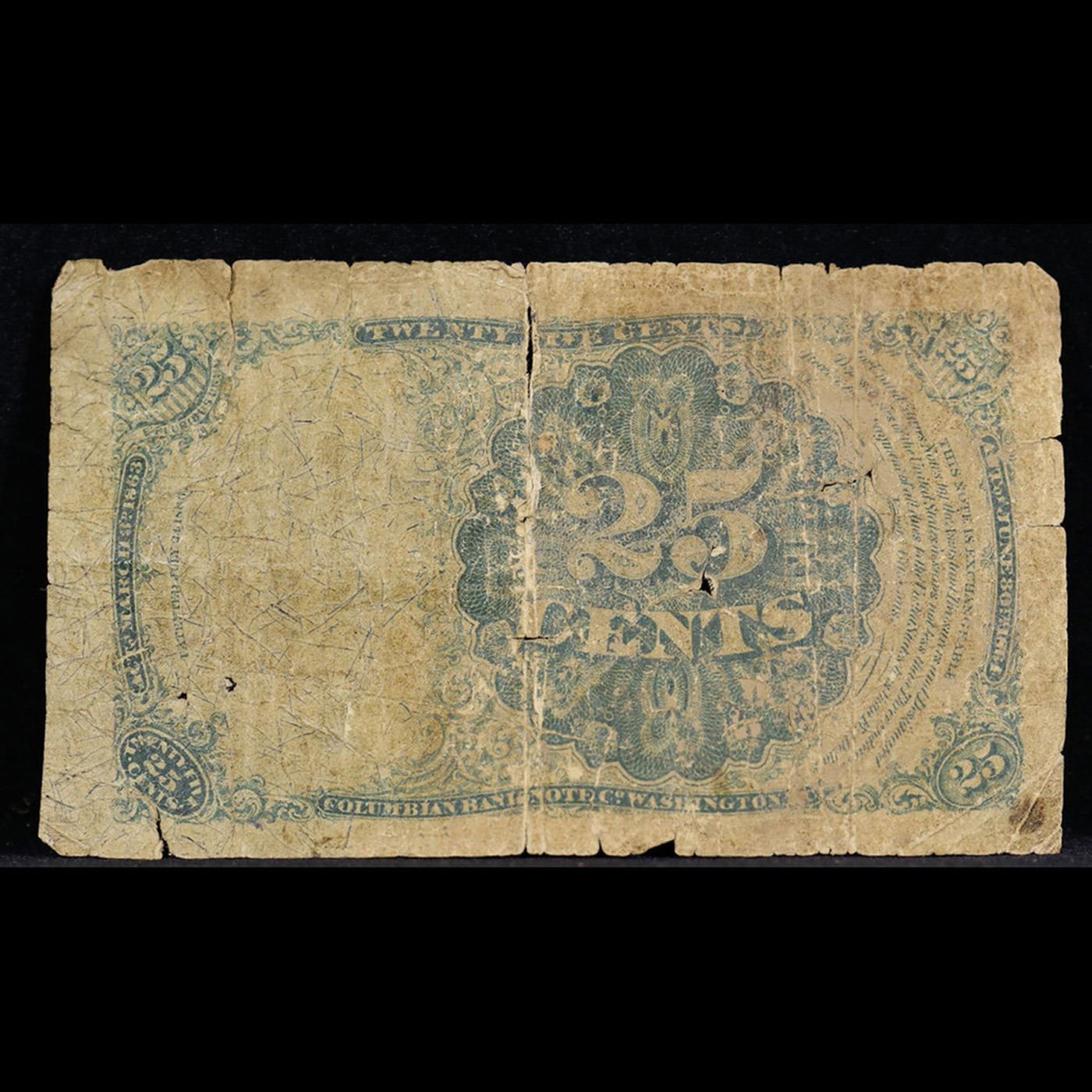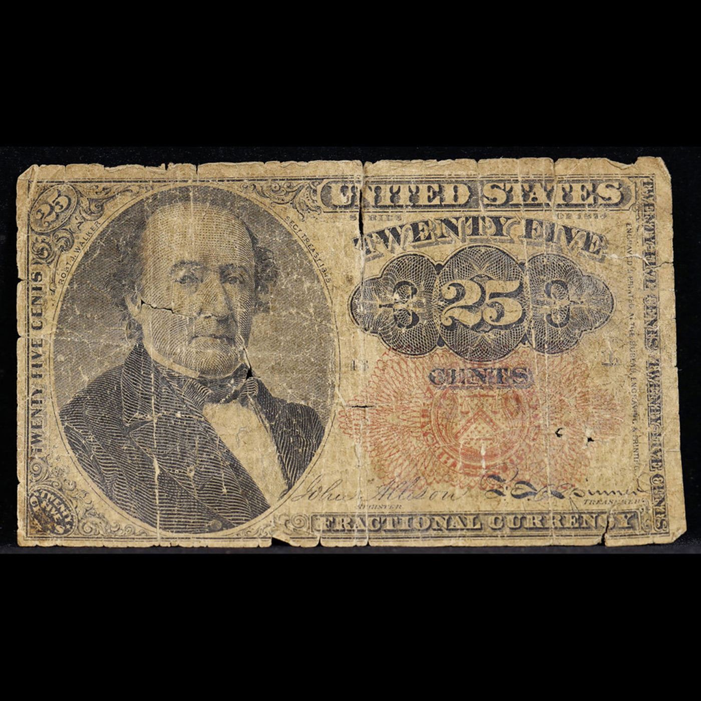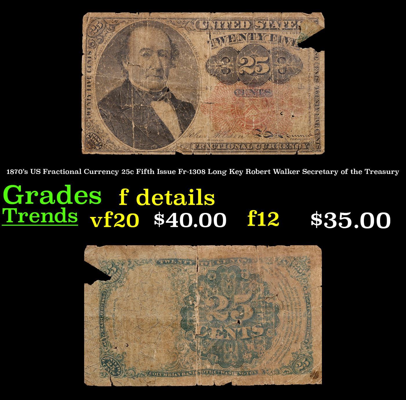 1870's US Fractional Currency 25c Fifth Issue Fr-1308 Long Key Robert Walker Secretary of the Treasury Grades f+. Fractional or postage currency has a rich history. At the beginning of the Civil War people starting hoarding coins for their precious metal content. Coins became difficult to find because of the hoarding. People started to try to use stamps instead of coins as a means of commerce. The government decided to help ease the hoarding issue by issuing “paper coins” also known as postage currency or fractional currency. Fractional currency was first issued on August 21, 1862 and they were last issued on February 15, 1876. Three cents, five cents, ten cents, twenty-five cents, and fifty cents notes were all issued. Fractional currency is physically smaller than other United States money. It also does not have a serial number. William Meredith is pictured on the front.