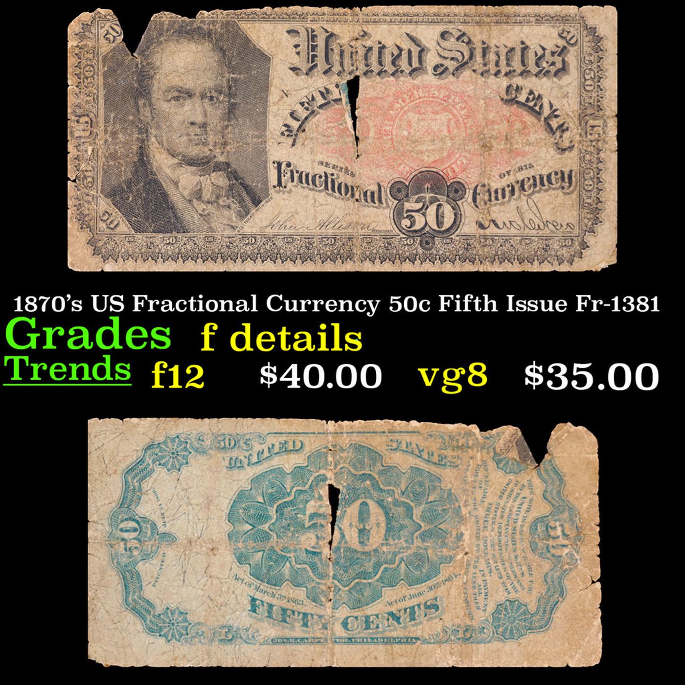 1870's US Fractional Currency 50c Fifth Issue Fr-1381 Grades f details. Fractional or postage currency has a rich history. At the beginning of the Civil War people starting hoarding coins for their precious metal content. Coins became difficult to find because of the hoarding. People started to try to use stamps instead of coins as a means of commerce. The government decided to help ease the hoarding issue by issuing “paper coins” also known as postage currency or fractional currency. Fractional currency was first issued on August 21, 1862 and they were last issued on February 15, 1876. Three cents, five cents, ten cents, twenty-five cents, and fifty cents notes were all issued. Fractional currency is physically smaller than other United States money. It also does not have a serial number.